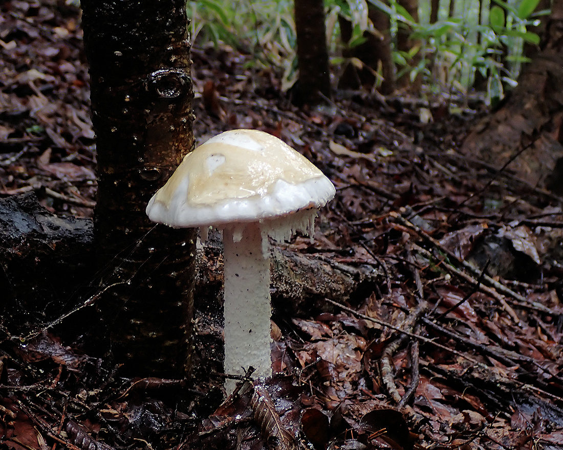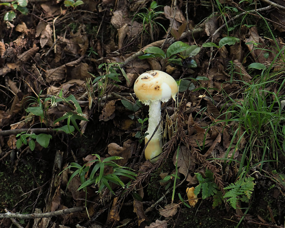 図鑑によると類似種に猛毒菌のドクシロテングタケ(仮称)があるとのこと。つぼがマツかさ状との記述があるが、全体がシロテングタケの酷似しているとのこと。