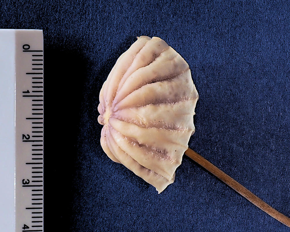 1.0-2.5p 鐘形→まんじゅう形→やや中高の平 放射状の溝あり 中央部に網目状小じわあり 地色は淡帯黄色 溝部分は帯褐紫色で明瞭な条線をなす