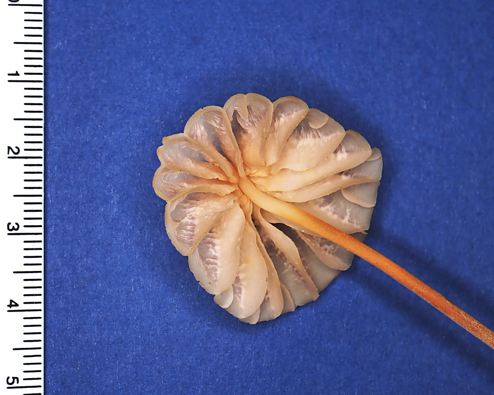 3.5-11.0cm×1-2mm 細い針金状 微毛におおわれる 帯褐橙黄色だが上部は白色 基部は多少太まる−または根状に伸びる 粗毛におおわれる