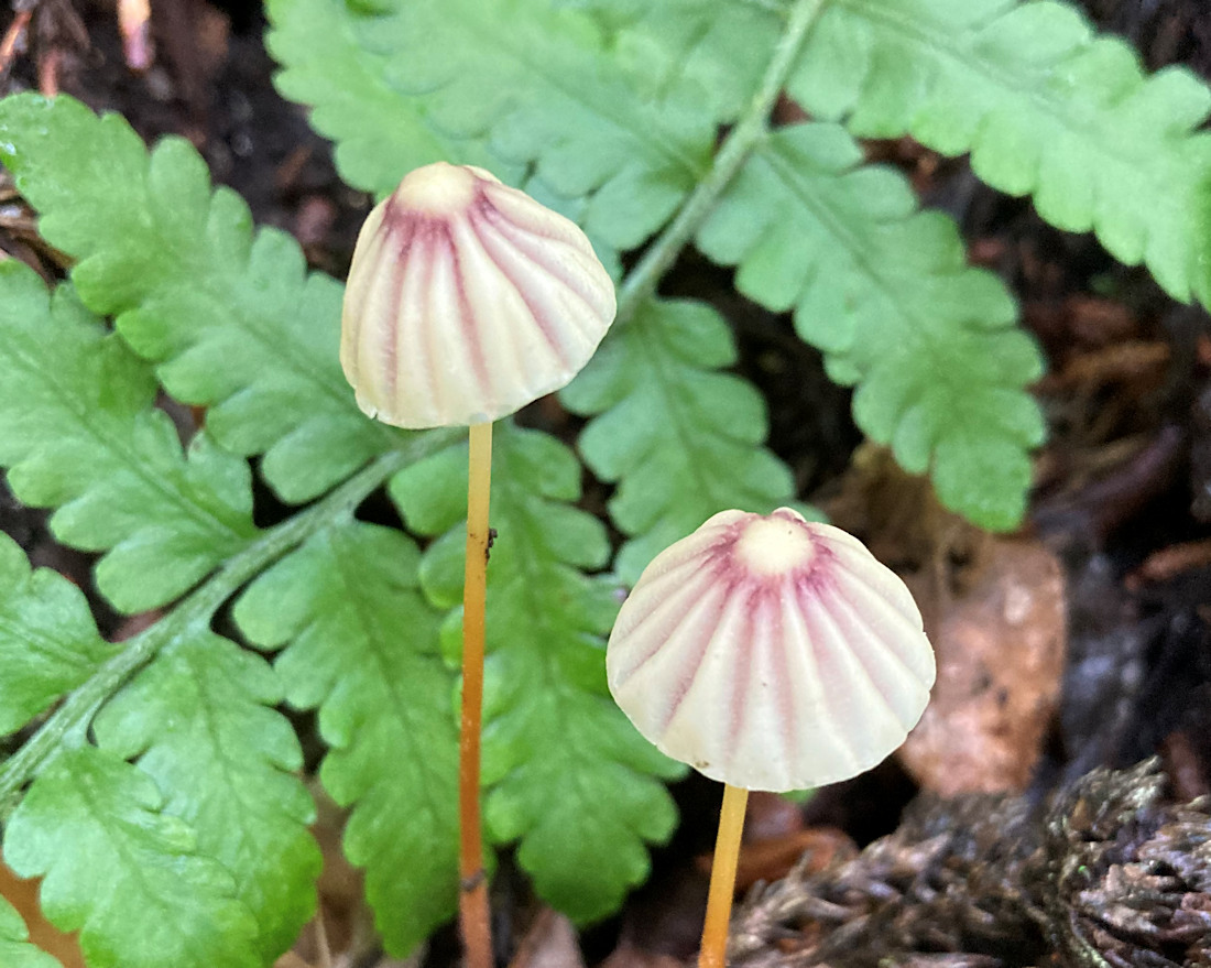 ハナオチバタケに類似しているが、スジオチバタケは傘の溝線が紫色を帯びていることで区別できる。