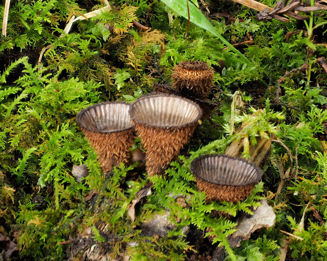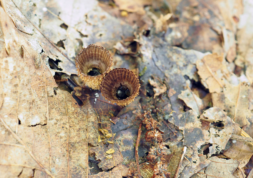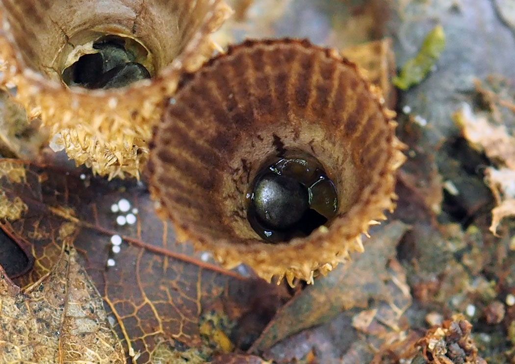 高さ5-10o 口径5-9o 倒円錐形で基部に小短柄のあるコップ形 外皮は淡褐色−褐色−暗褐色の粗毛密生 →粗毛脱落し赤褐色−黒褐色で平滑になる 孔口の縁も同様 成熟前は白色の薄い紙質の膜あり 内側の上半部に30本前後の条溝あり 内部の底に黒い塊粒あり 塊粒はレンズ形で径1.5o 裏面中央に凹部あり