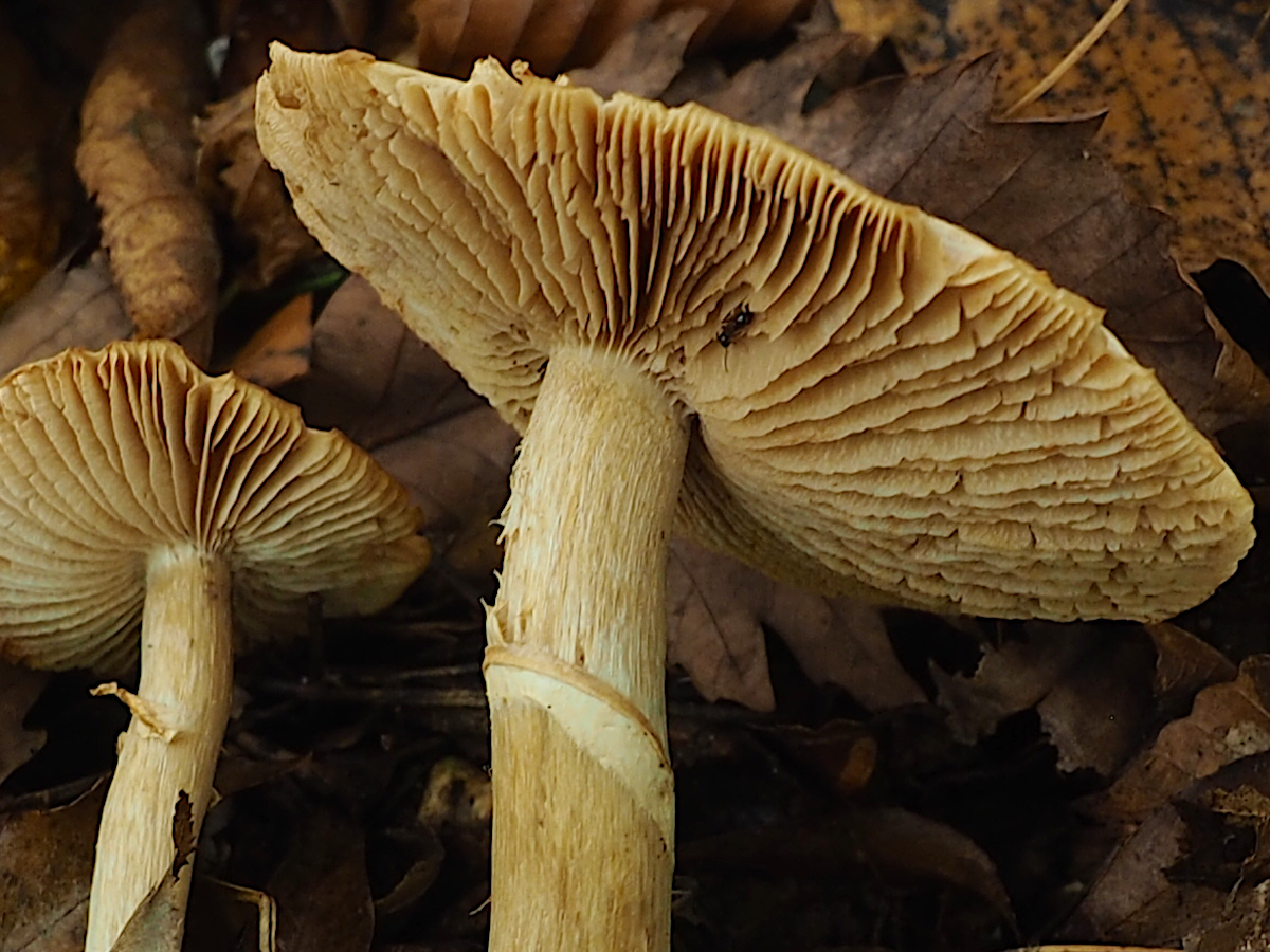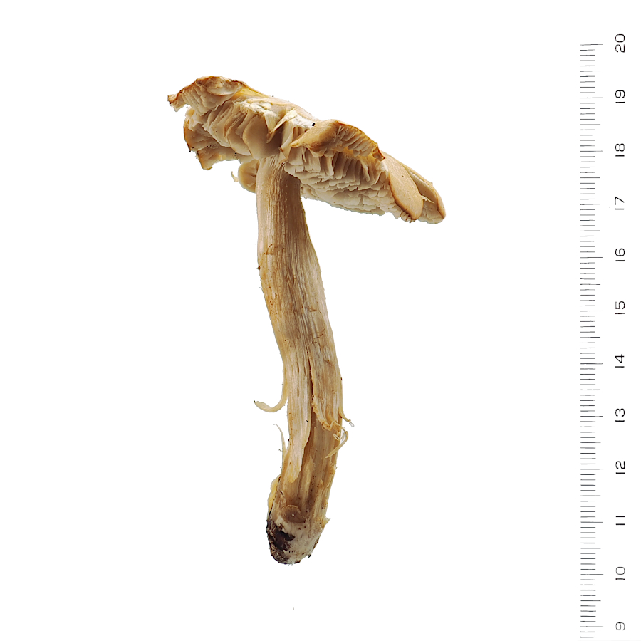 6.0-15.0p×7-25o 傘より淡色 繊維状 下から1/3位の位置に類白色膜質のつばあり−不完全で消失しやすい 中実