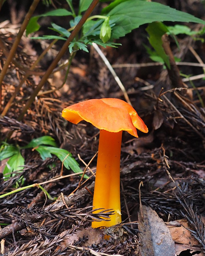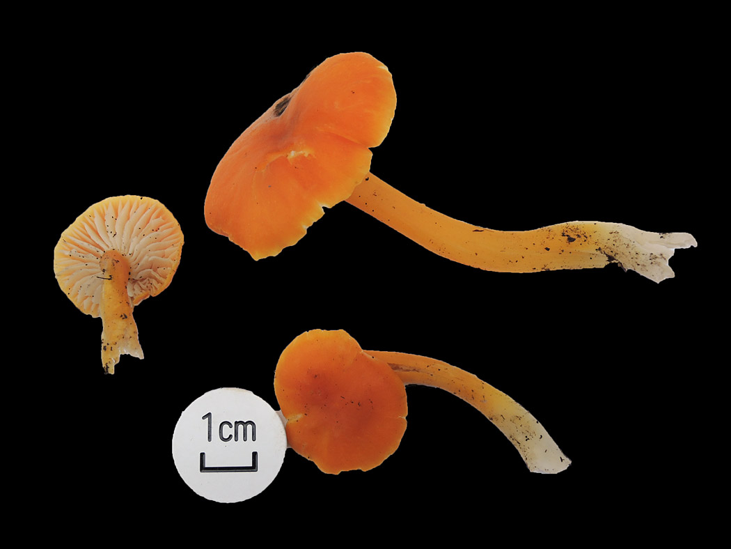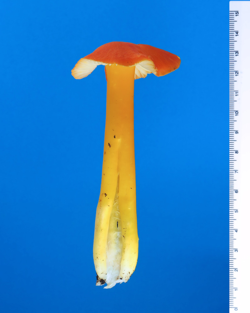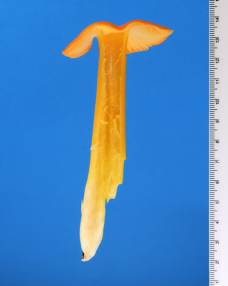 2-8p×5-8o 上部は朱色-鮮やかな橙黄色 下部は淡色-淡色‥ほとんど白色 中空 しばしば扁平になる