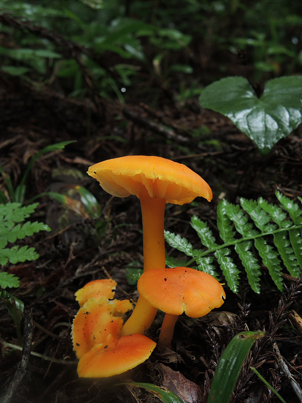 1.5-5.0cm まんじゅう形→平たいまんじゅう形で中央部凹む−平ら 鮮やかな朱色(橙赤色)→退色し黄色 粘性なし 平滑