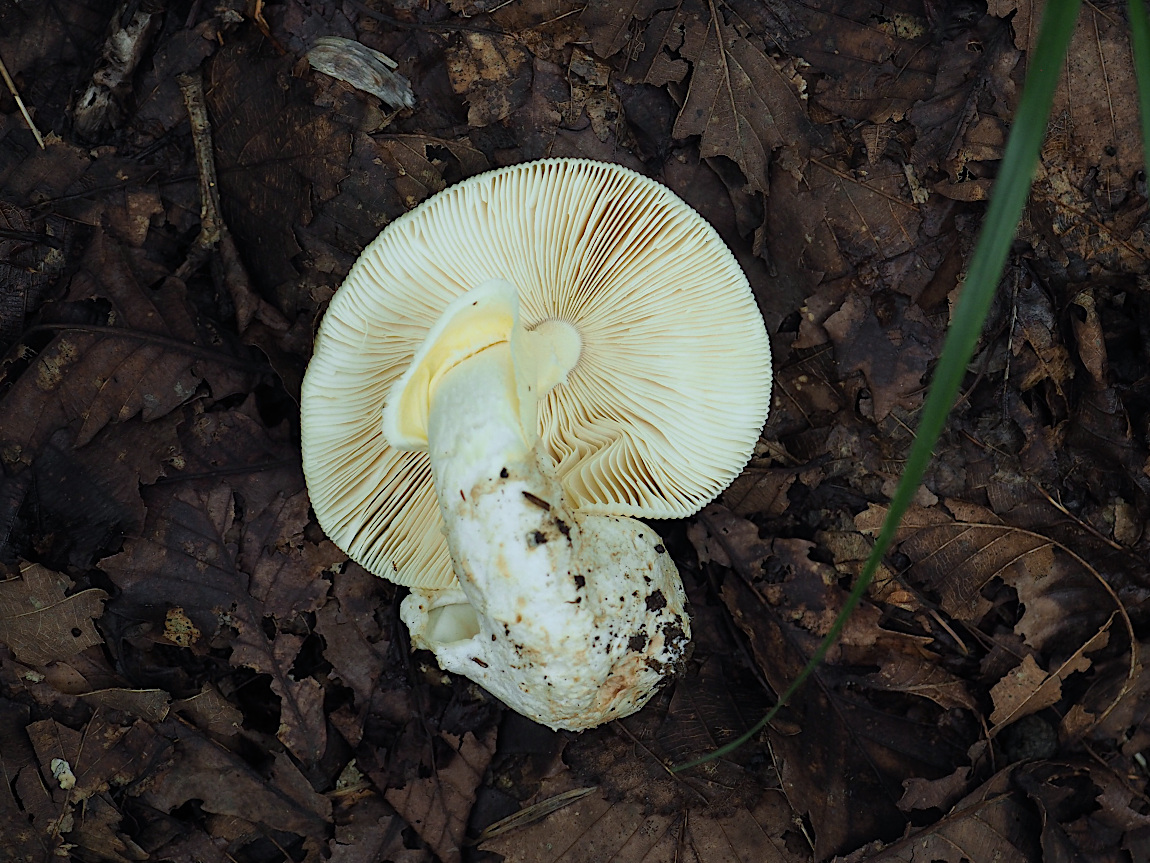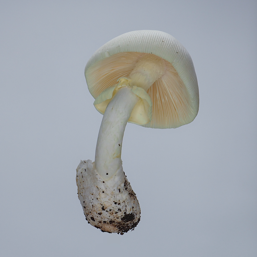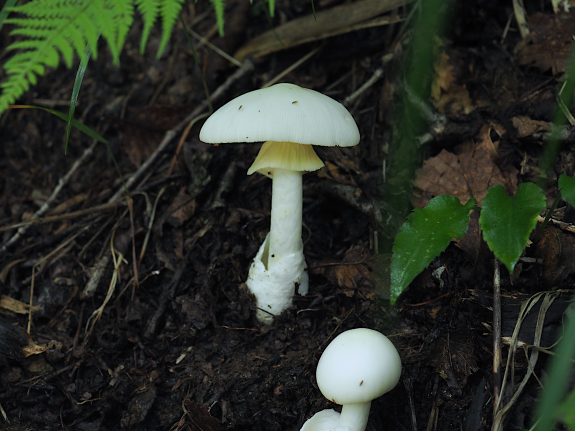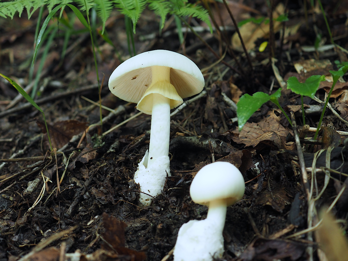 ほぼ上下同大 白色 だんだら模様がない 上部に淡黄色の膜質つばあり つぼは白色の大形で袋状で厚膜質 中空
