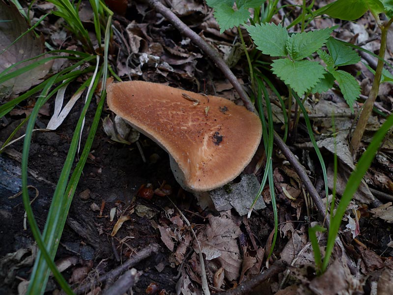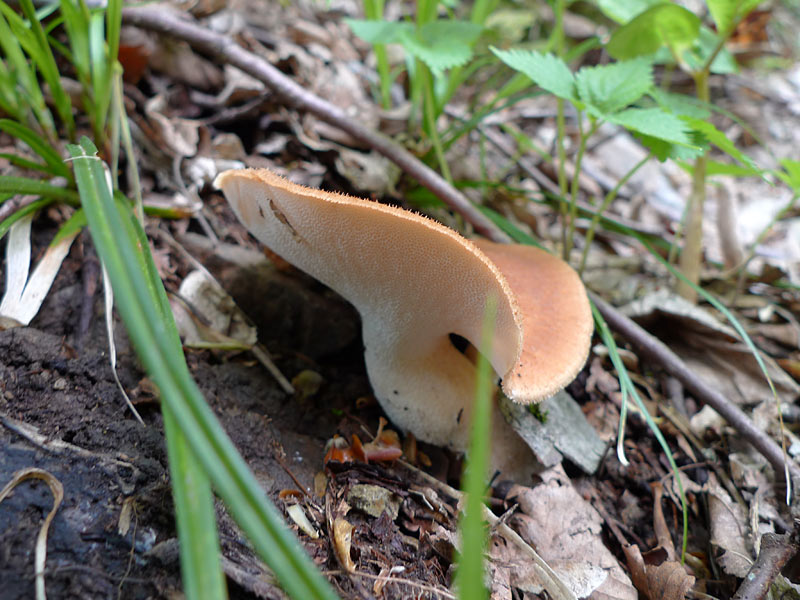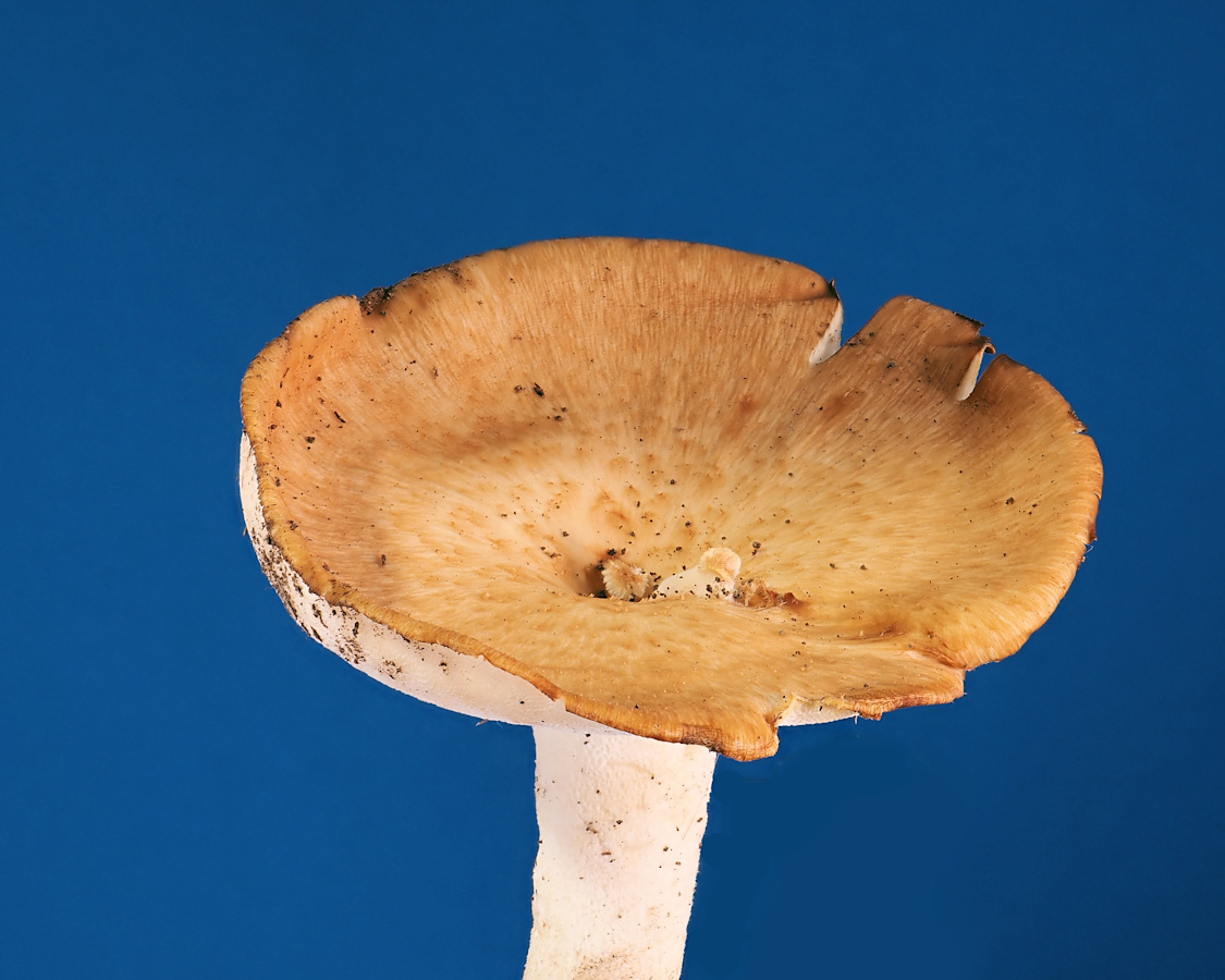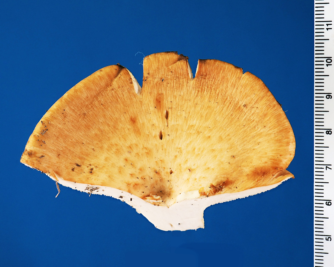 径4.0-12.0cm×厚さ5-10mm ほぼ円形→浅いろうと状 黄茶色−淡褐色 平たく密着した濃色の繊維状鱗片を生じる