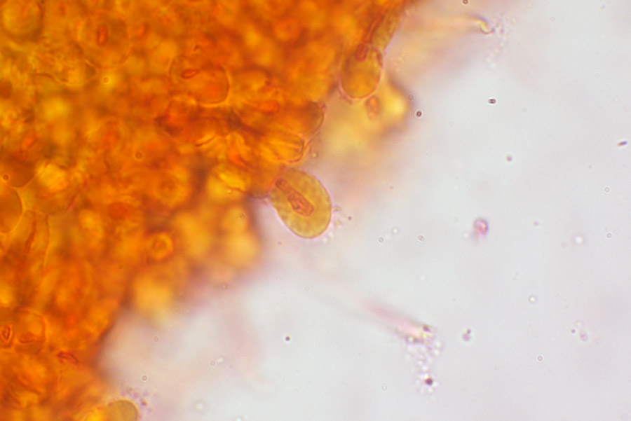 高さ4-8o 椀の径は4mm前後 洋盃形→盃形→成熟時しばしば盾形に広がる 深さ3-4o 柄の高さ8o前後 橙黄色−黄色 軟骨状膠質 乾燥するとかたい軟骨質 外面に縦じわあり