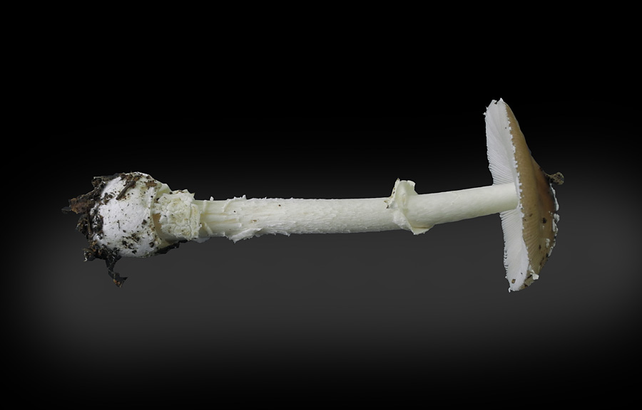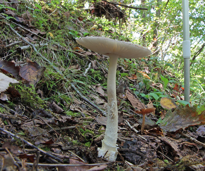 5.0-35.0cm×6-30mm 類白色 上下同径−下方やや太まる 上から1/3ぐらいに白色膜質つばあり つばより下方多少ササクレ状 基部は肥大 つぼの名残が指輪状−リング状 中空