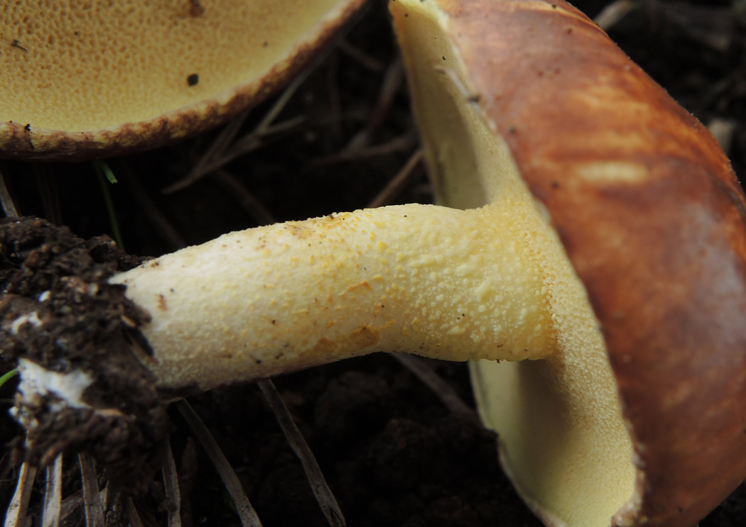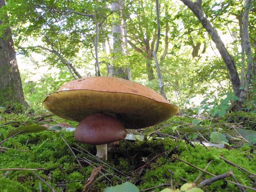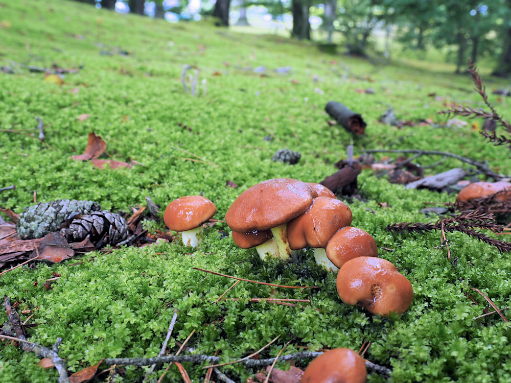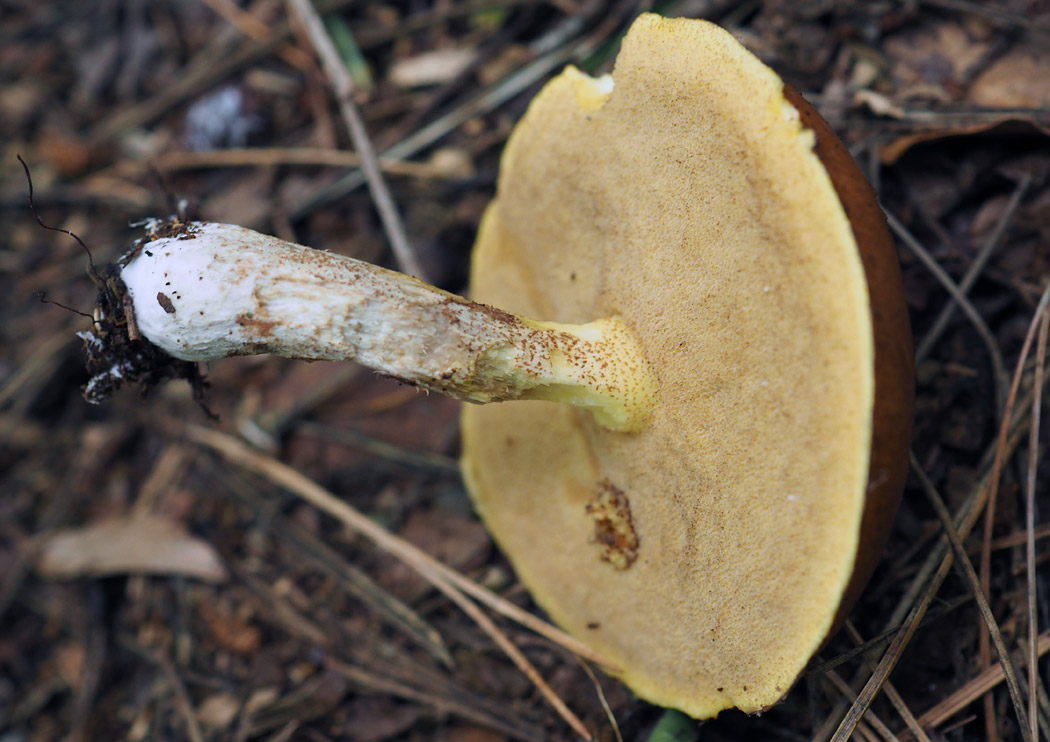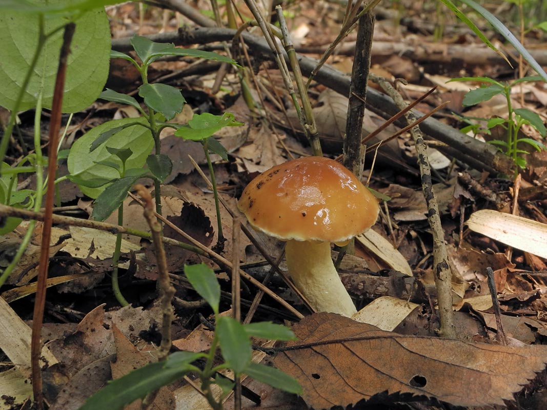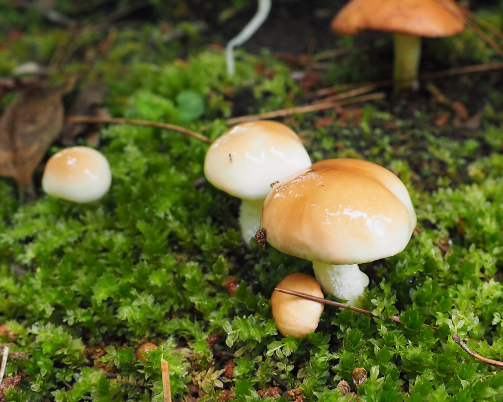 夏〜秋にアカマツ林など二針葉マツ−まれに五針葉マツ樹下に発生する