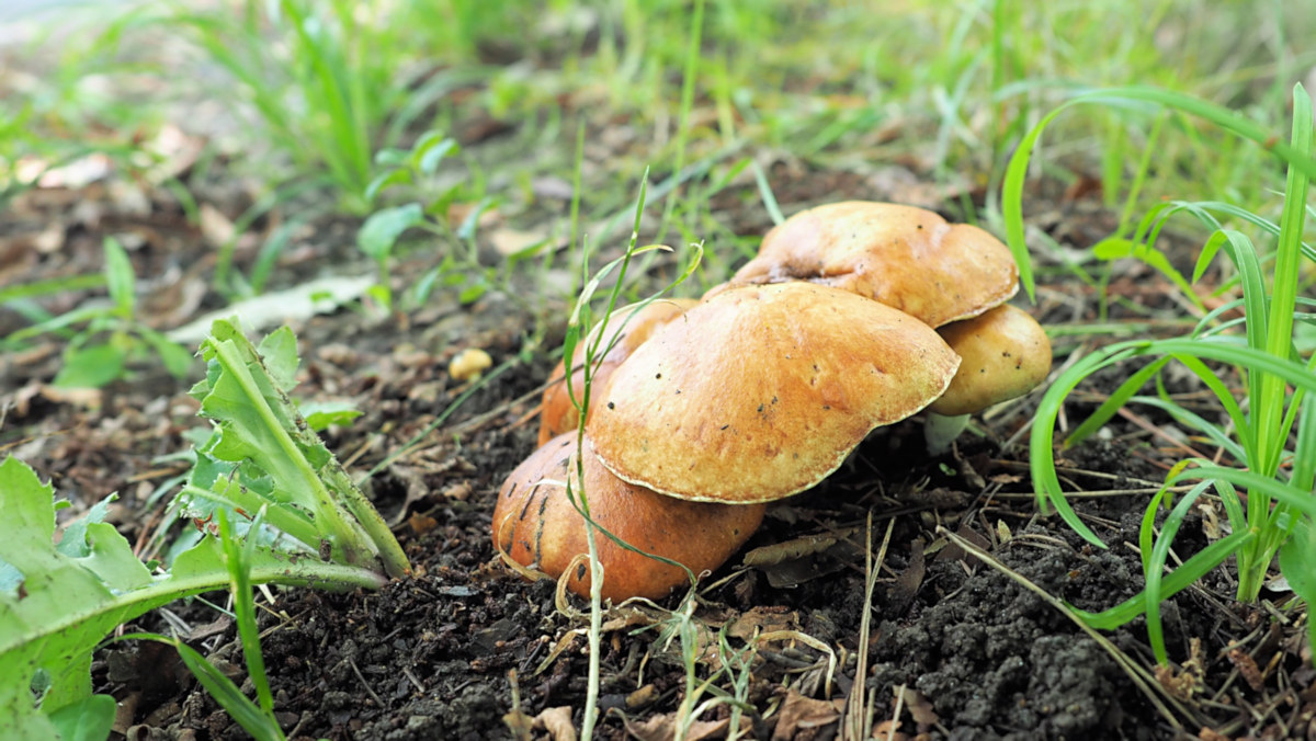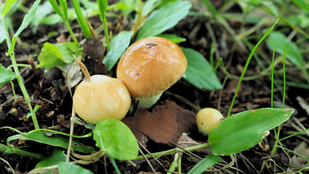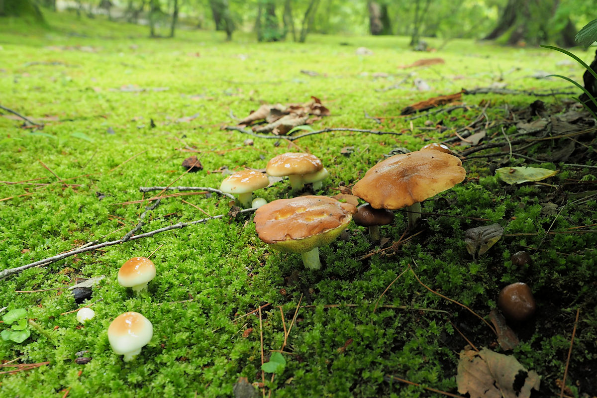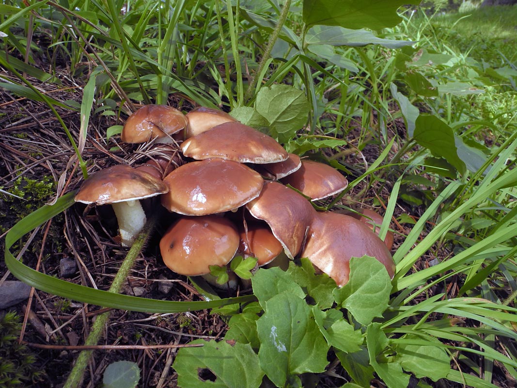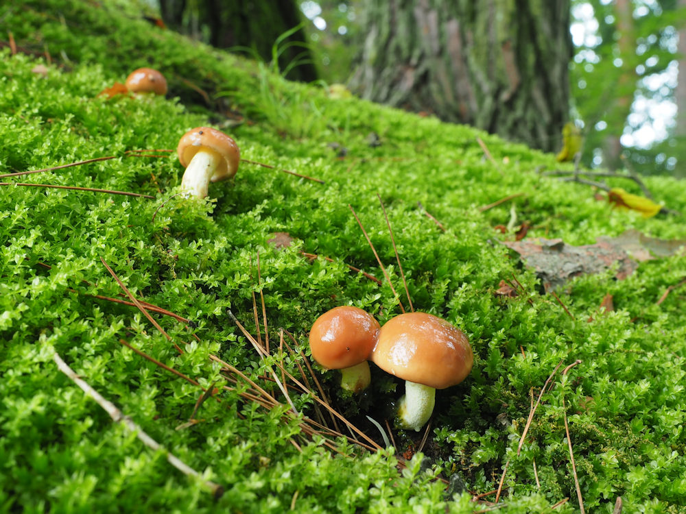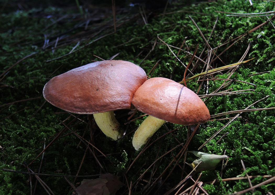夏〜秋にアカマツ林など二針葉マツ−まれに五針葉マツ樹下に発生する