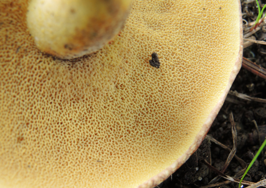 鮮黄色→黄褐色 上生−多少垂生−直生 長さ6mm内外 孔口は類円形−不整多角形状 小形 幼子実体は黄白色乳液分泌→乾くと黄褐色−古い子実体では多数のしみ生じている
