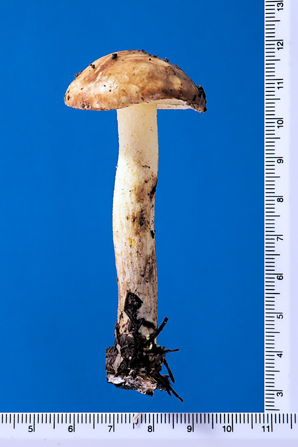5.0-6.0cm×7-18mm 上下同径−下方細まる 地色は黄白色−黄色 柄と同色→褐色の細粒点を密布 つばは無い 中実−ときに中空