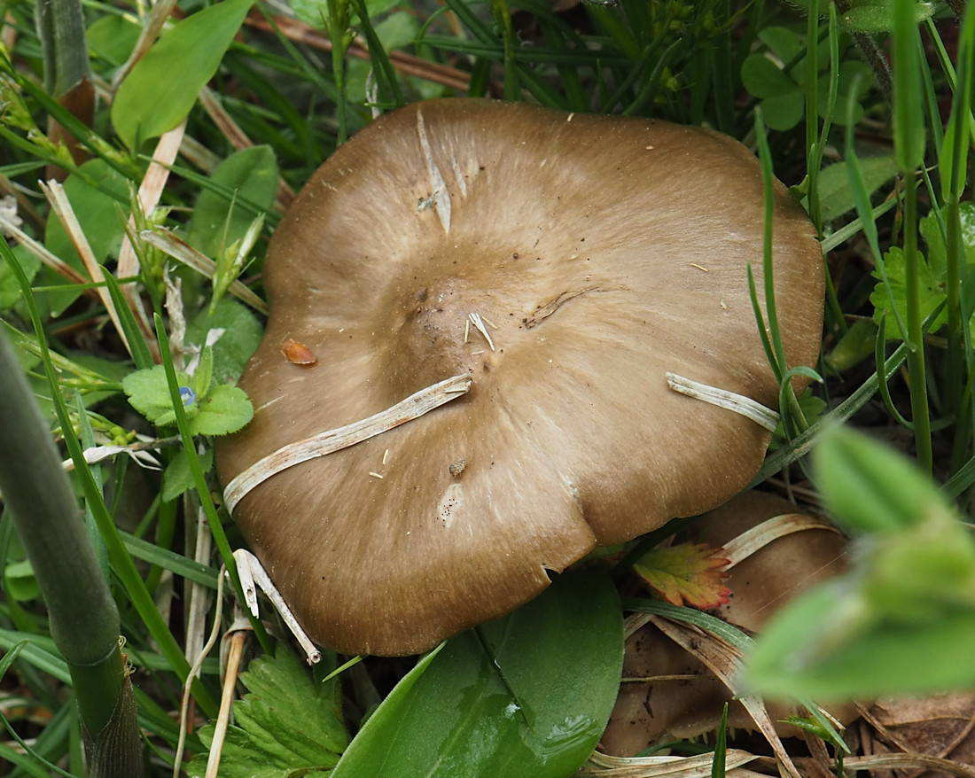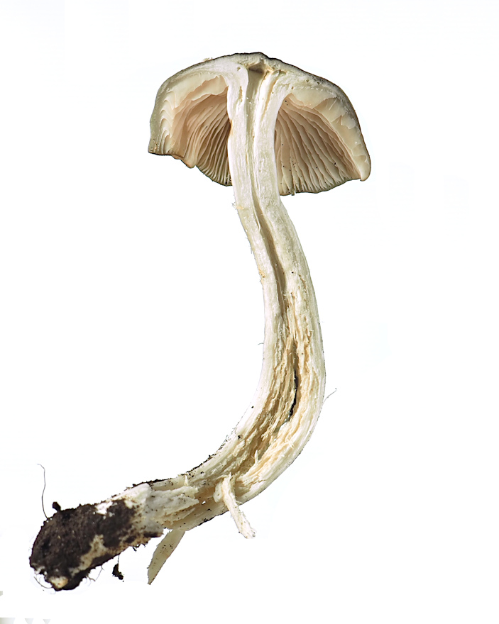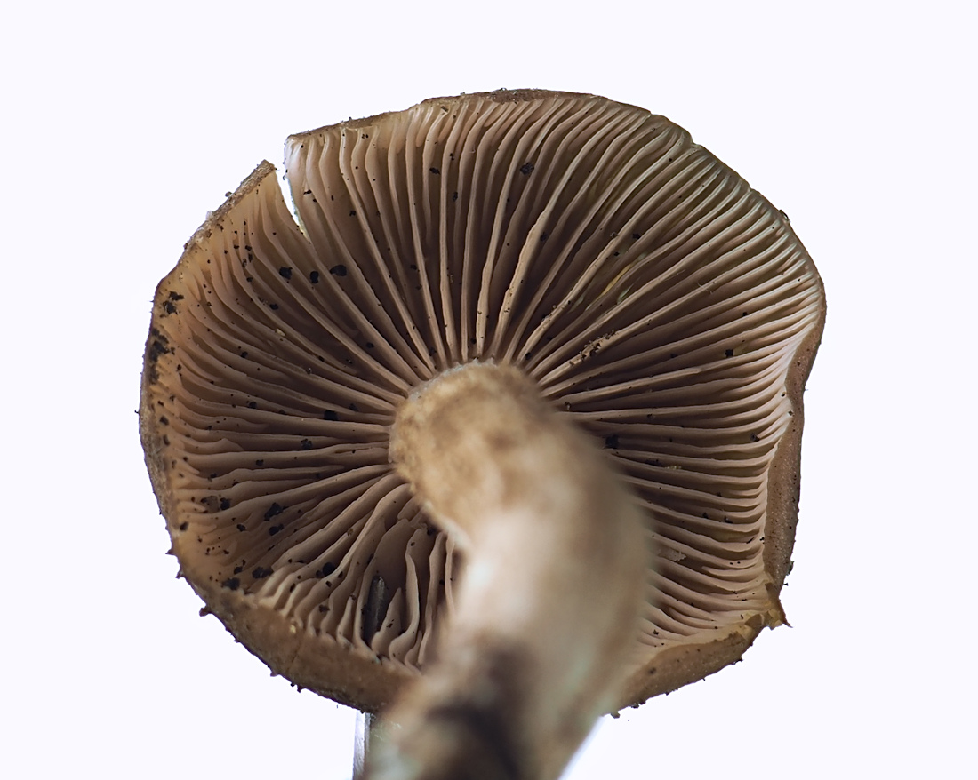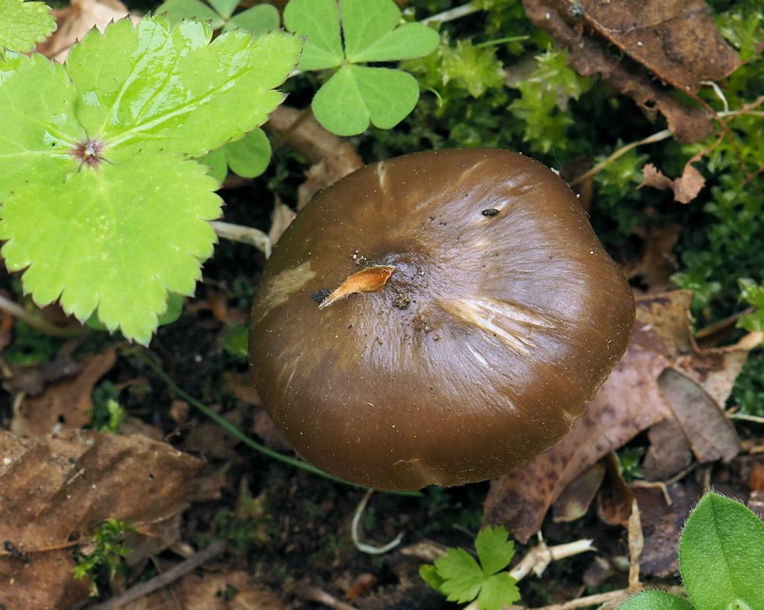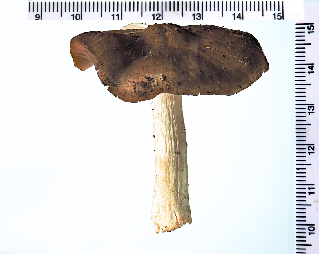 2.0p-8.0p 円錐状→鐘形→平らな鐘形状 明瞭な中丘(中心突起)がある 吸水性 湿時は暗褐色−暗灰褐色 光沢がある ややバター性 縁から中心のほぼ半分まで条線あり 乾燥時は淡褐色−黄土褐色−灰黄土色で条線無し 絹状 平滑 縁は薄く、長い間内巻き