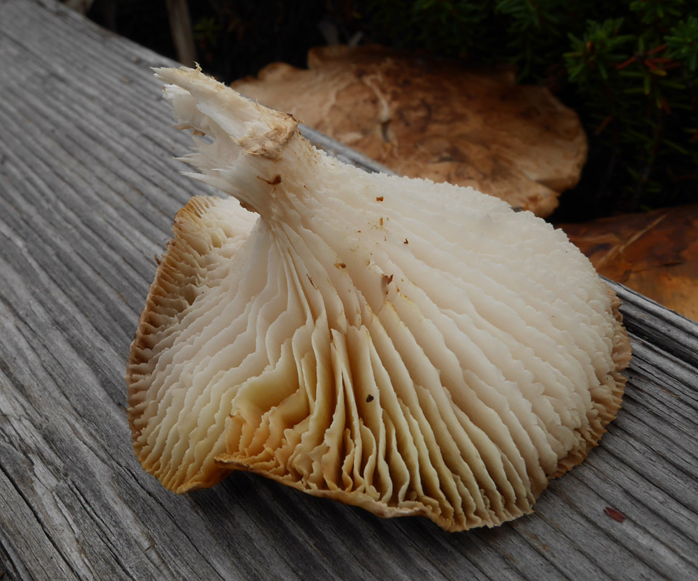 黄白色−白色 縁は鋸歯状 垂生し末端は柄に線状に流れる やや疎