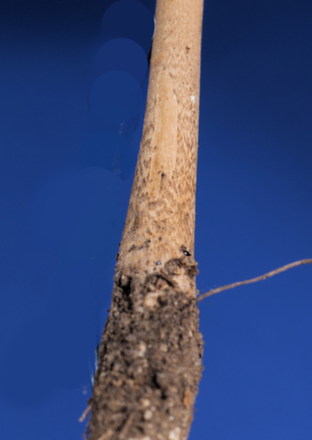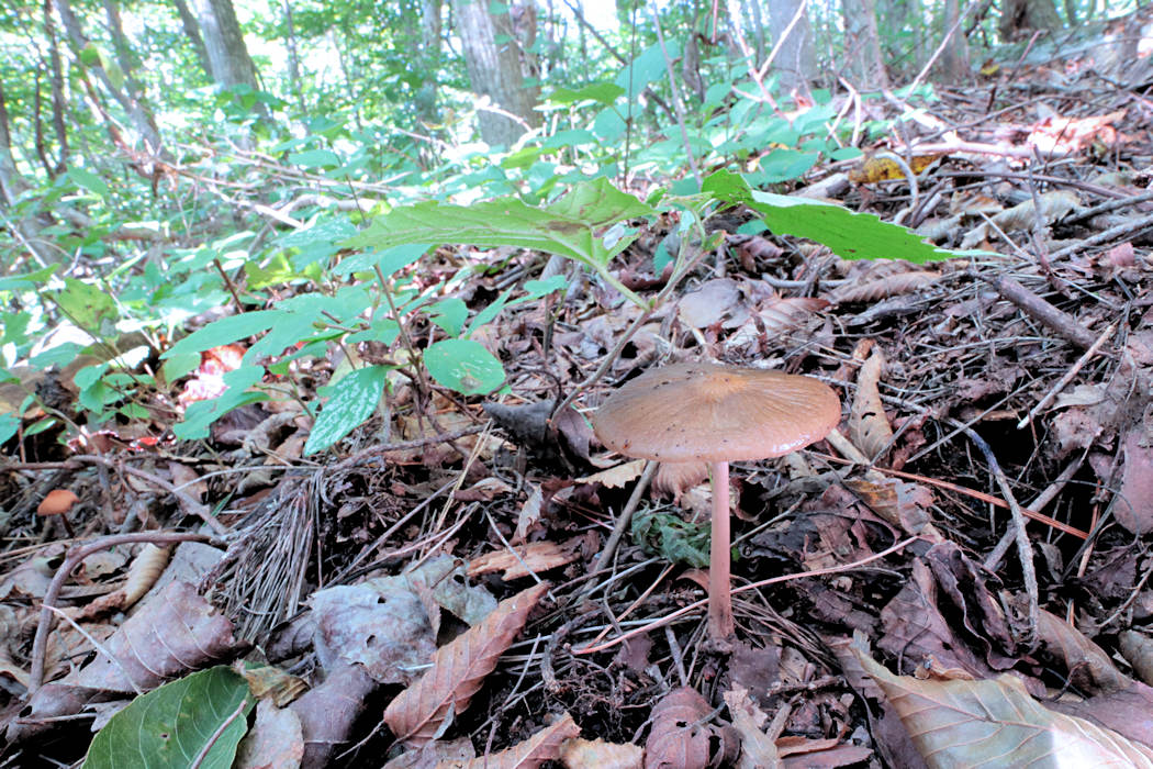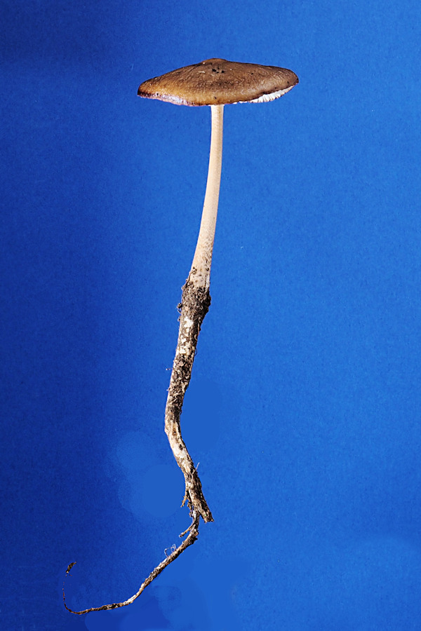 長さ12.0cm前後 直径5-8o 傘と同色だが上部やや淡色で濃色のだんだら模様あり 上に向かって細まり基部やや肥大 長く根状で地下に伸びる 中実