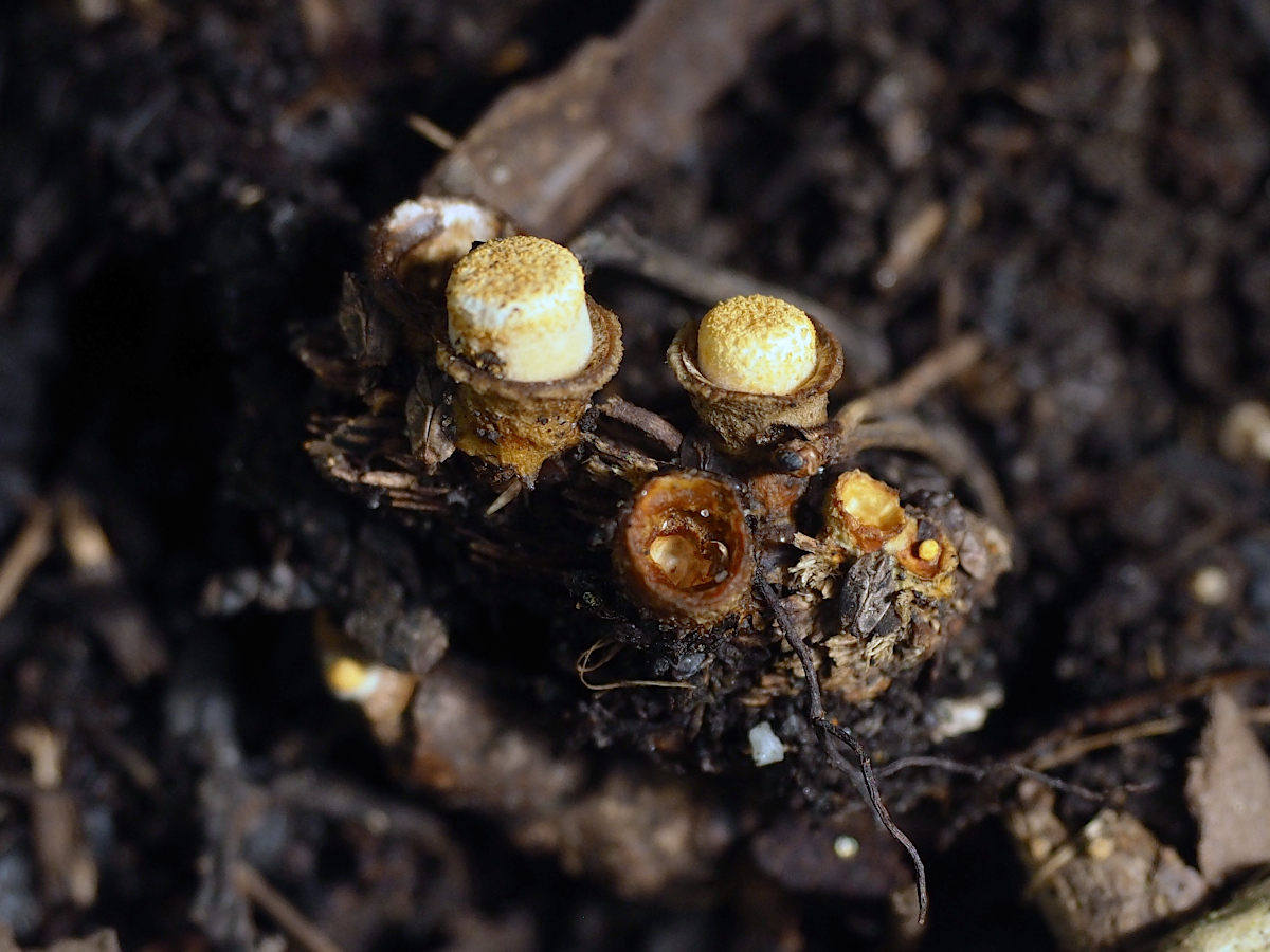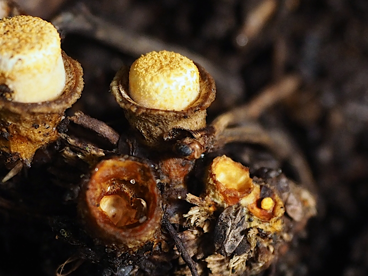 幼菌時は黄色−黄土色の球体→細毛が密生→卵形→洋梨形 上部の表隔膜は2層→表隔膜裂開し高さ8o×口径4-8oで、内部に小塊粒あり。小塊粒はレンズ形で 径0.8-1.2o×厚さ0.5mm 外皮膜はやや厚く白色−黄白色 小塊粒は黒褐色で光沢あり 裏面中央にひも−へそのおをつける