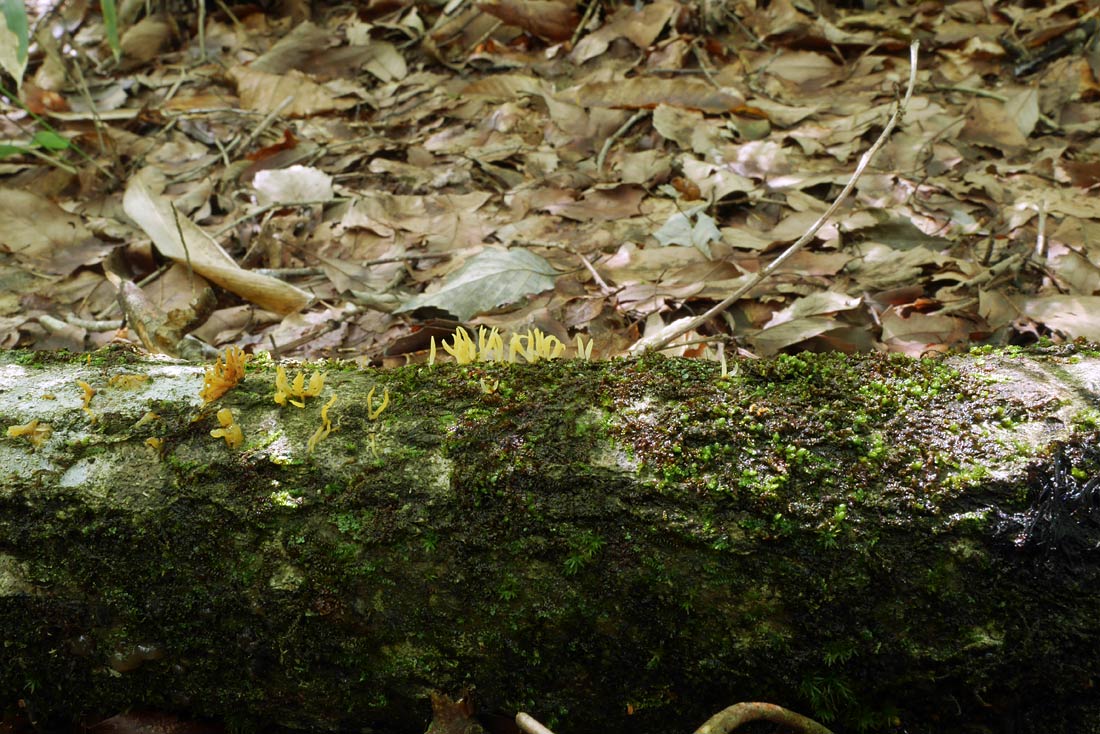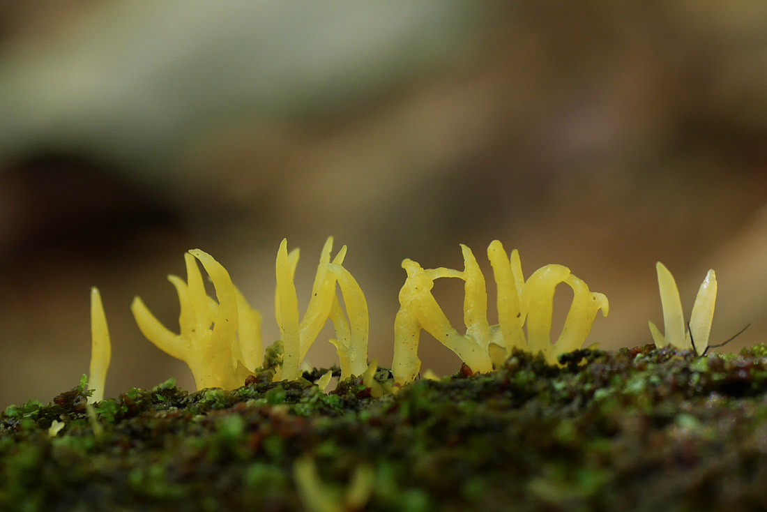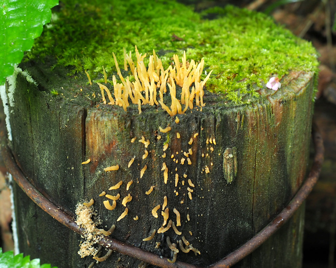 高さ5-10o 径1mm前後 上下同福−ときに中央膨らみ上部に向かい細まる 先端が尖る−鈍頭 ときに基部または先端部で分枝 堅いゼラチン質−軟骨状にかわ質 淡黄色→橙黄色 先端は濃色 多少ぬめりあり