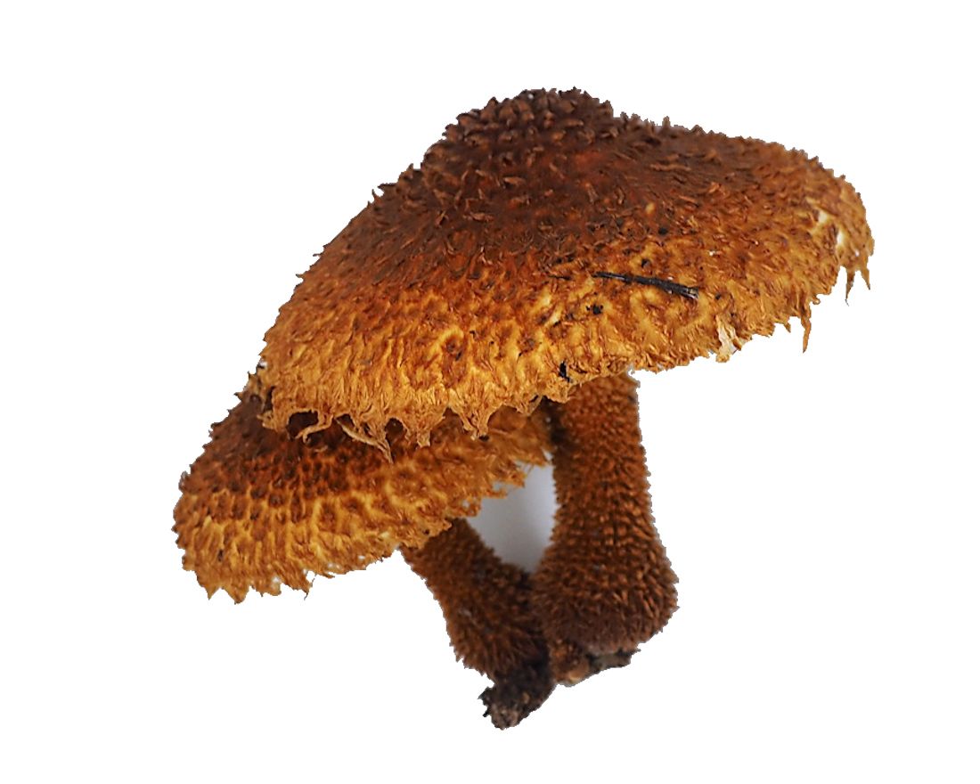 径6.0cm前後 半球形→やや中高の平ら 茶褐色 大型の反り返った繊維状鱗片密布 中央付近では直立