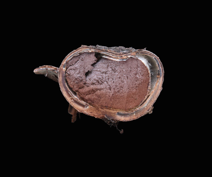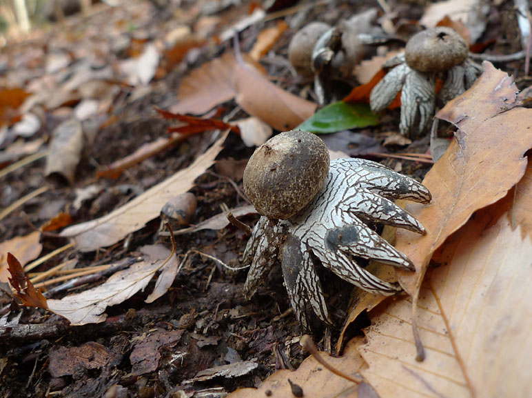幼菌は半地中生−地中生 径2.0pほど 球形−扁球形 表面は灰褐色−黒褐色 基部に黒色の根状菌糸束がつく 熟後6−10片の星形に裂けて開く 内層は白銀色で亀甲状にひび割れる→しだいに消失する 内皮は薄膜 平滑−ときに細毛あり 淡灰褐色で袋状 頂孔を1個開き胞子塊を放出