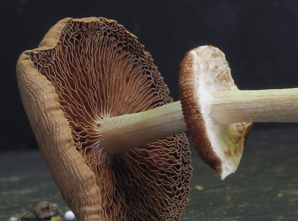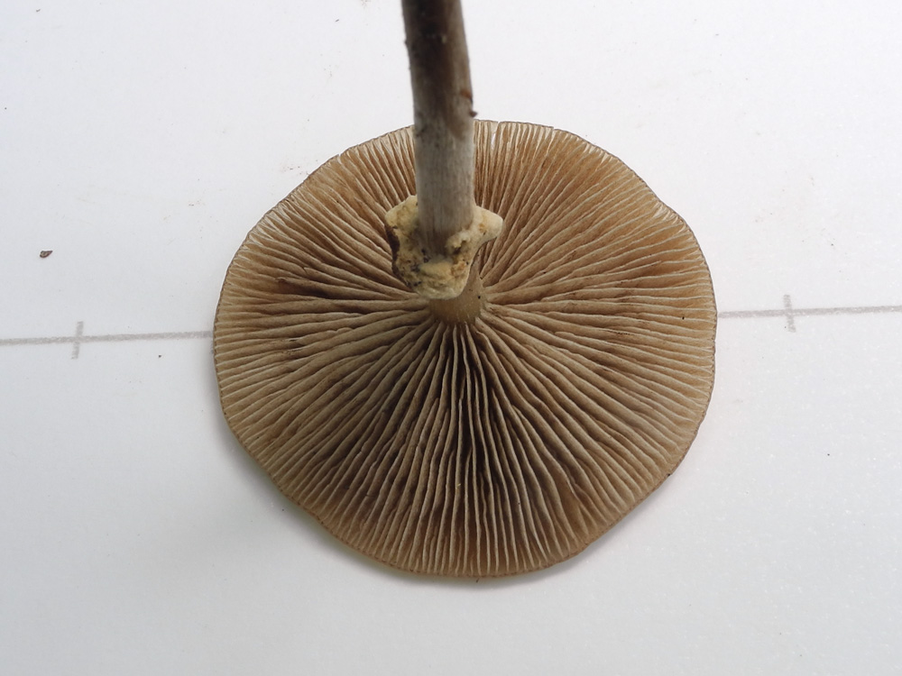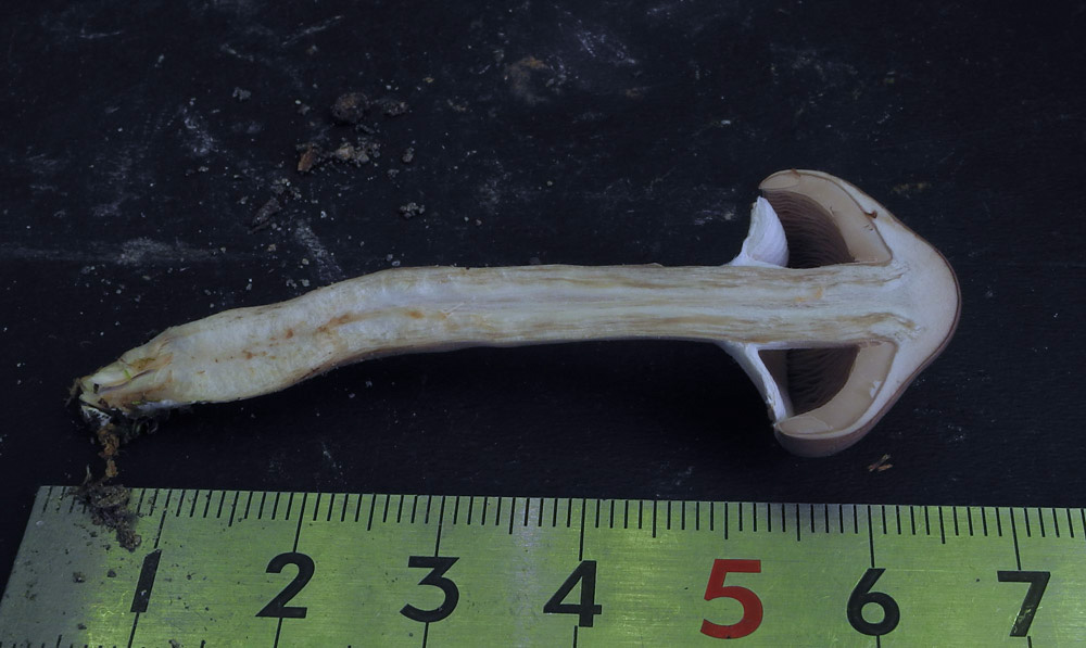 3.0-6.0cm×4-10mm 下方に多少太まる 基部細まる 表面は多少繊維状 上半部は類白色 下半部は汚褐色 つばは柄の下から2/3位にある 白色膜質 上面に条線あり 成熟すると胞子が落下しで茶褐色となる? 中実−中空