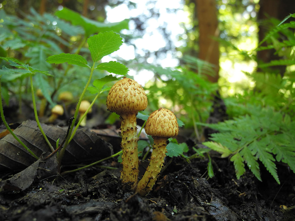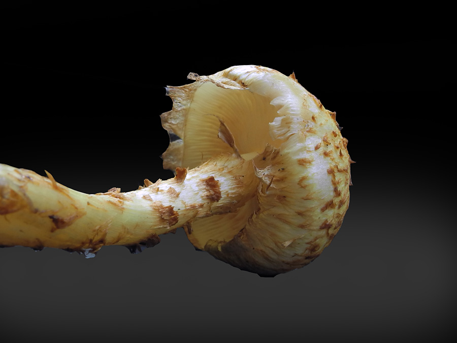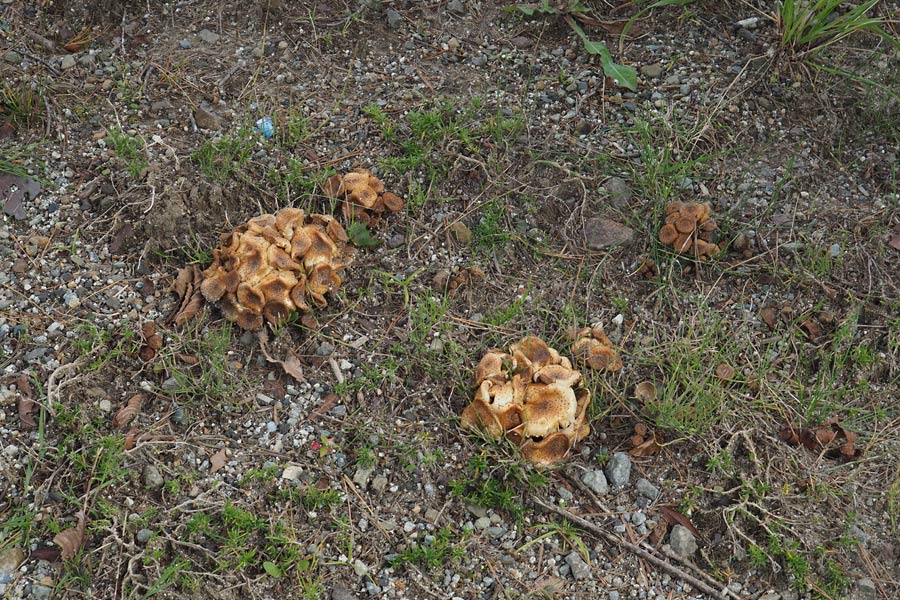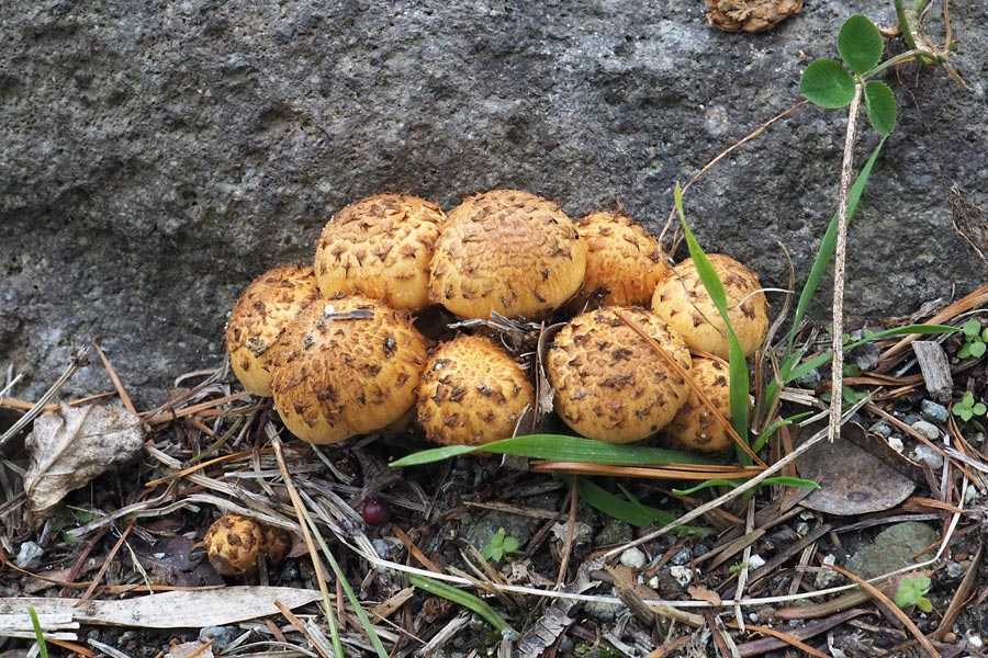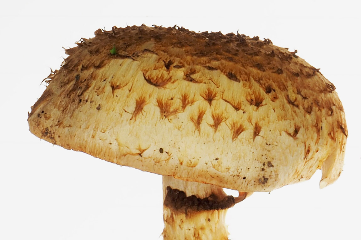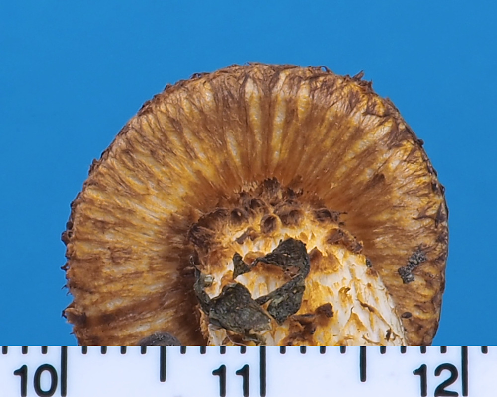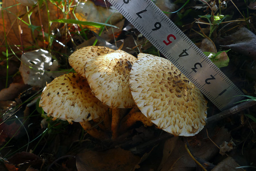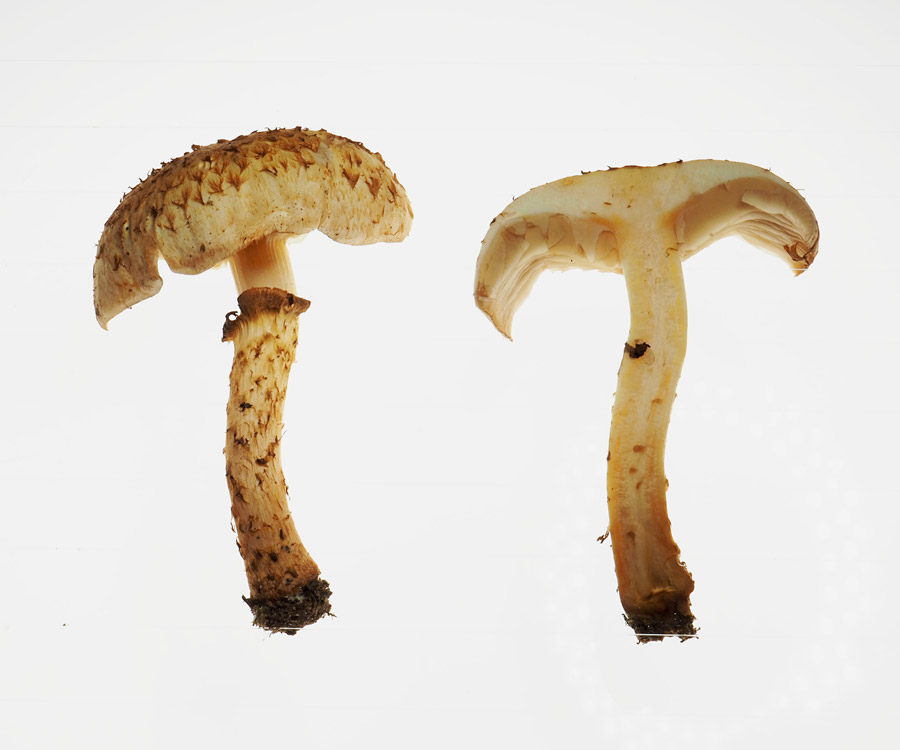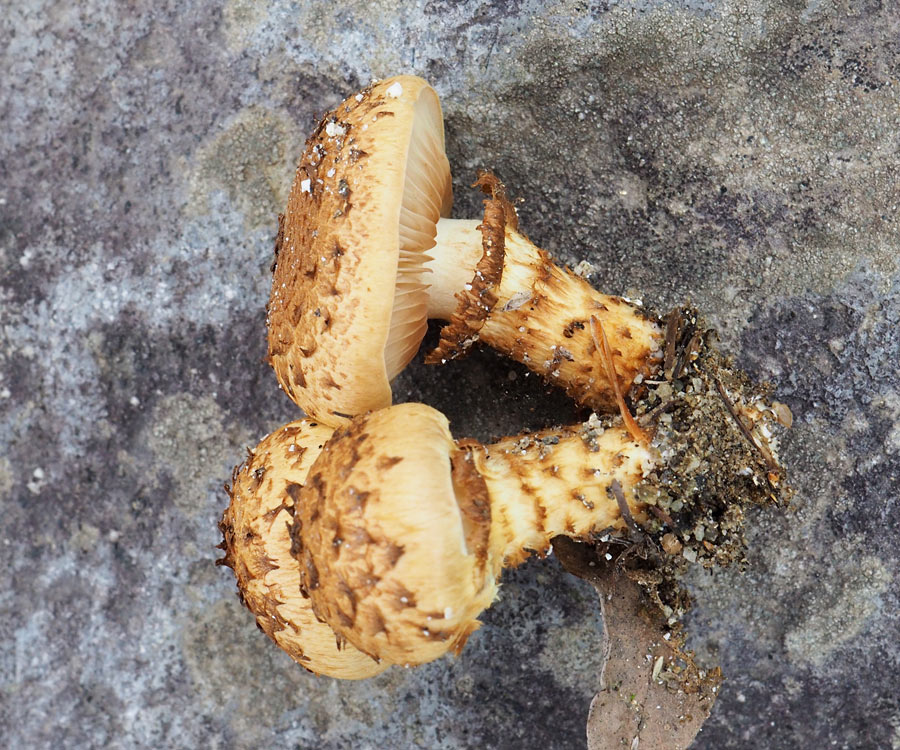 3.0-7.0cm やや円錐状山形→まんじゅう形→ほぼ平 淡黄色−淡黄褐色 褐色−暗褐色の荒いささくれ状鱗片でおおわれる 粘性なし