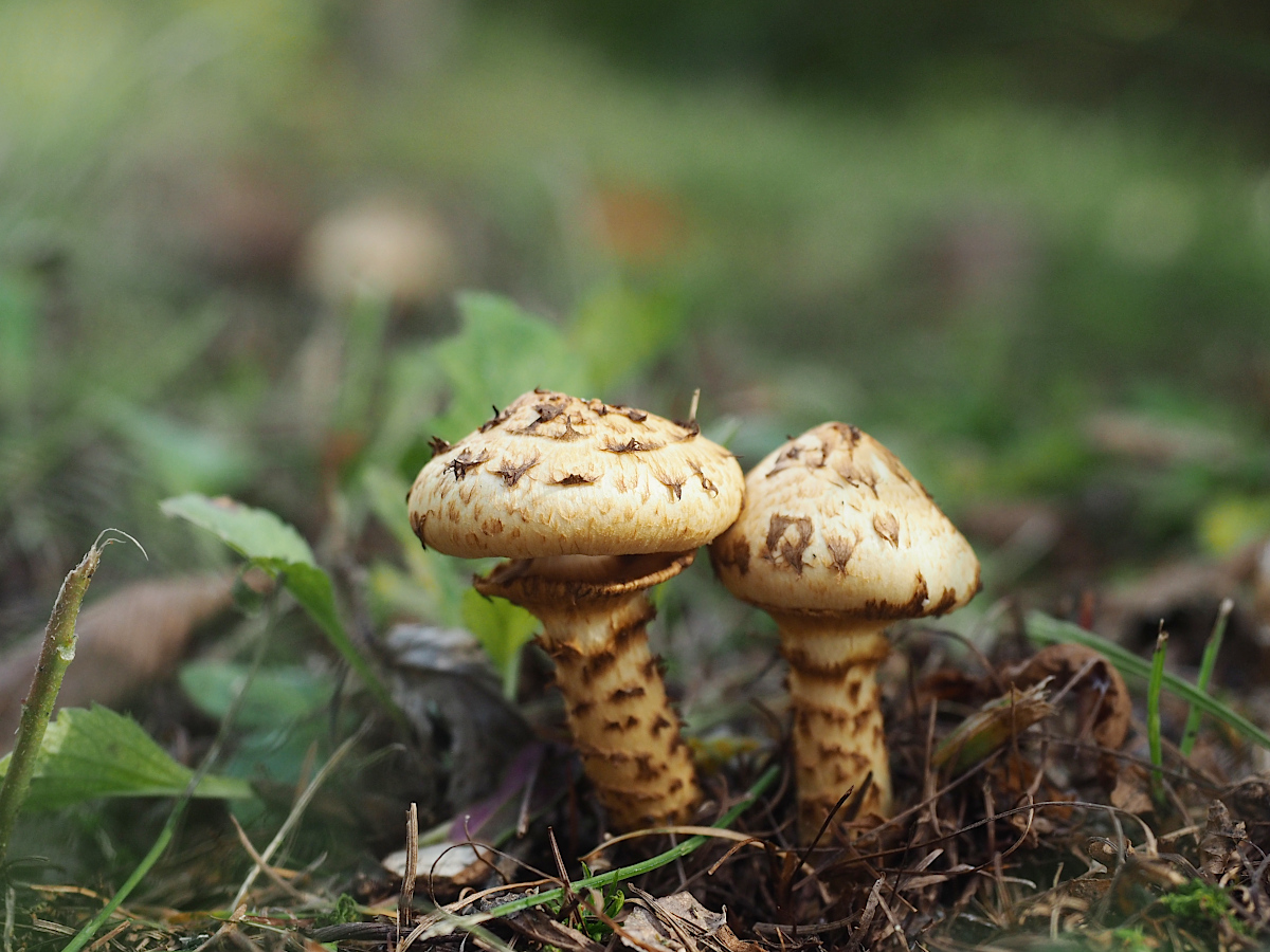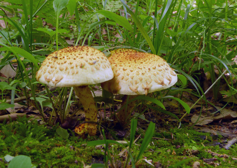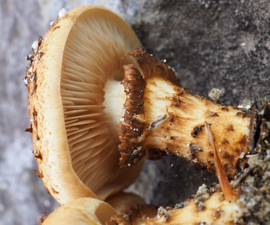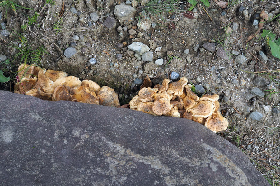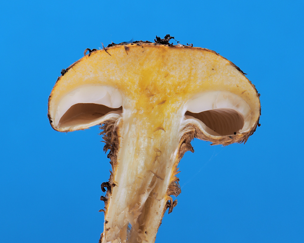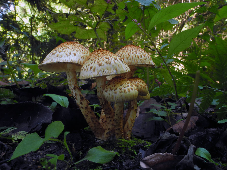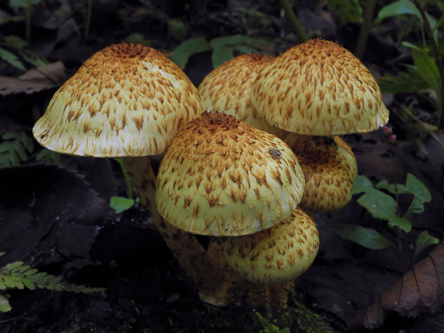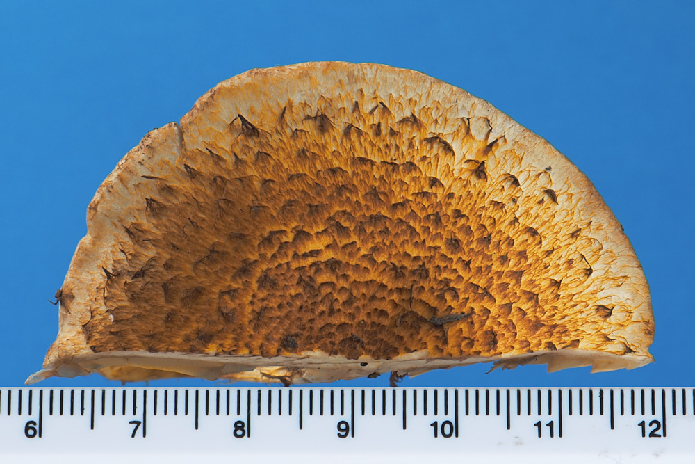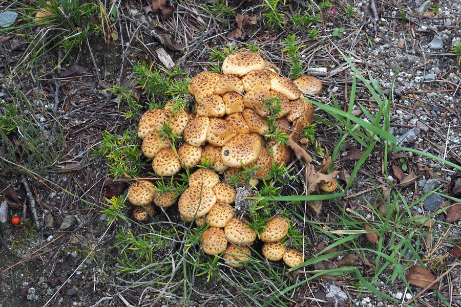 3.0-7.0cm やや円錐状山形→まんじゅう形→ほぼ平 淡黄色−淡黄褐色 褐色−暗褐色の荒いささくれ状鱗片でおおわれる 粘性なし