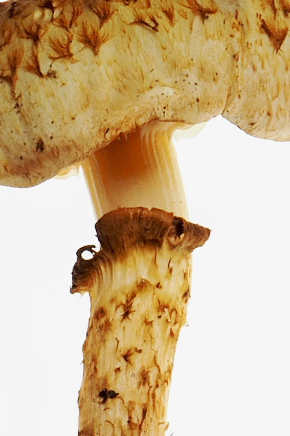 8.0cm前後×10mm前後 上下同径−下方に多少太まる 上位に繊維状つばあり その上方は淡黄白色 下方は傘と同色 傘同様の鱗片におおわれる 粘性なし 中実−基部付近はやや中空?