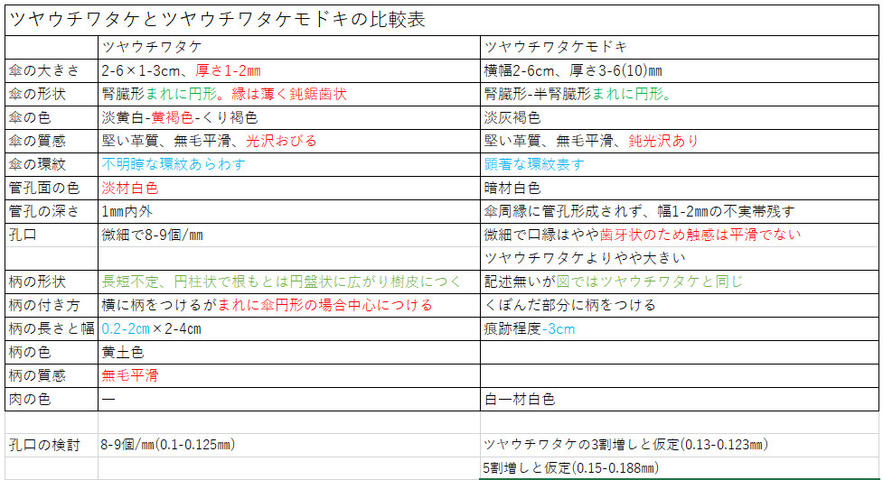 本種とツヤウチワタケモドキの特徴を比較表にまとめてみた。