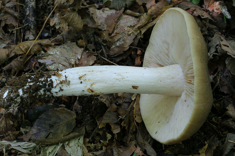 白色 傘中央厚い 周辺部薄い 表皮下は表面色 粉臭あり 特に柄は苦みあり