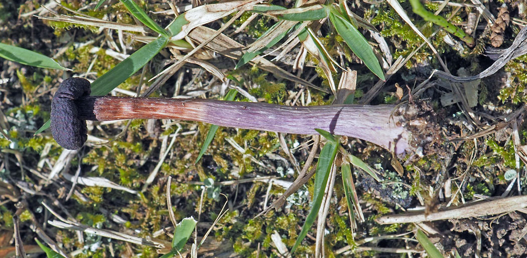 3.0-7.0cm×2-5mm 上下同径−下方太い 紫色→乾くと淡黄褐色−淡灰褐色 繊維状で多少ササクレて縦すじあり 中実−随状
