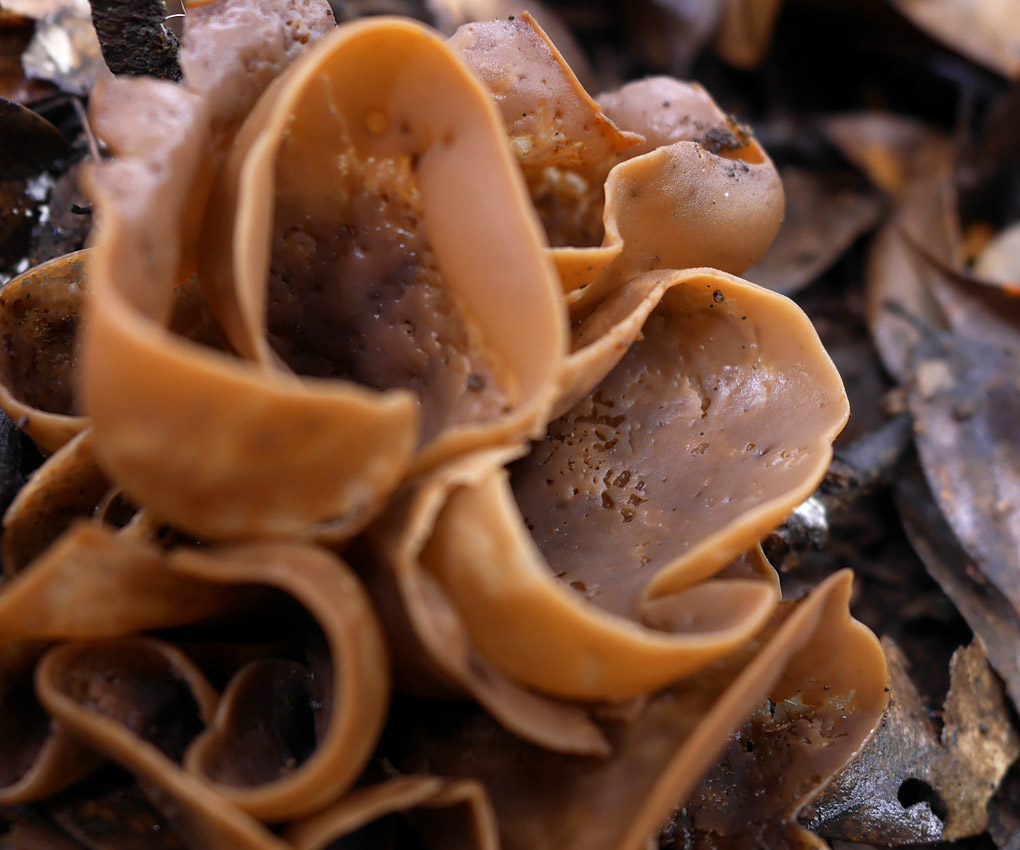 図鑑には(ウスベニミミタケ属(otidea)は10種ほどが日本産として記録されている。耳房形または一部が欠けた椀形であり、顕微鏡的