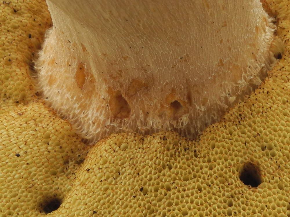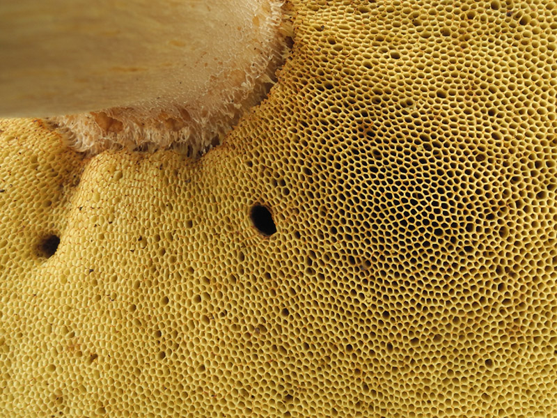 白色 帯黄オリーブ色−淡黄褐色‥淡橙黄色−帯喝黄色→帯褐橙色−黄褐色 直生状−上生−湾生状−柄の周囲でやや陥入 孔口は小形 管孔より淡色→同色 傷つくと濃色 ‥孔口も白色→帯橙黄色。)