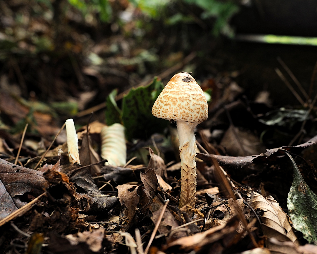 類似種のコゲチャワタカラカサタケは、傘の鱗片がこげ茶色を呈する