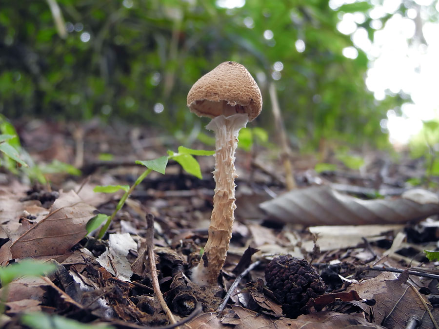 4.0-7.0cm 先の丸い円錐形→やや中丘の饅頭形→ほぼ平−中丘の平 帯黄色−帯黄土色−ニッケイ色−茶褐色 周辺淡色 フェルト状→表皮細裂し粒状鱗片となって散在 縁部に内被膜残片付着