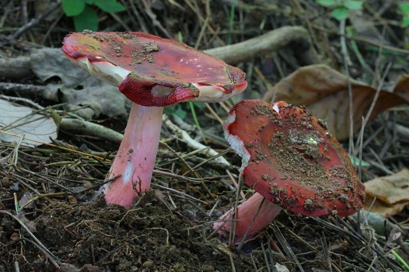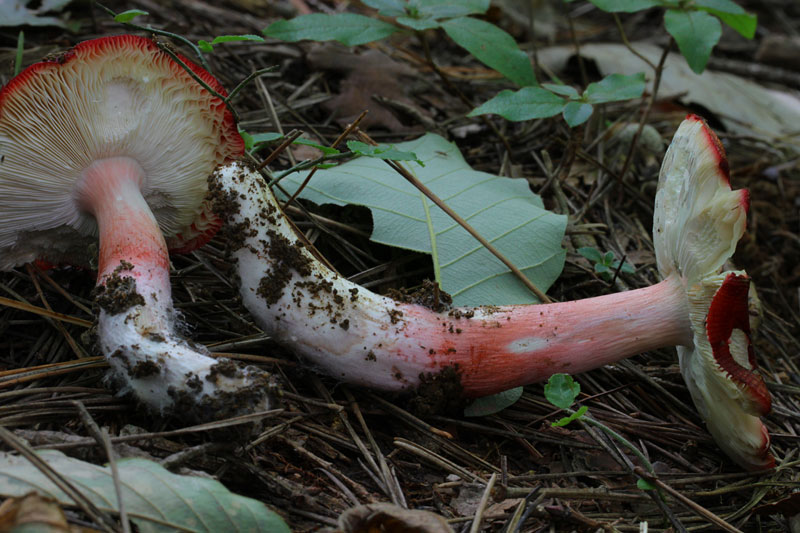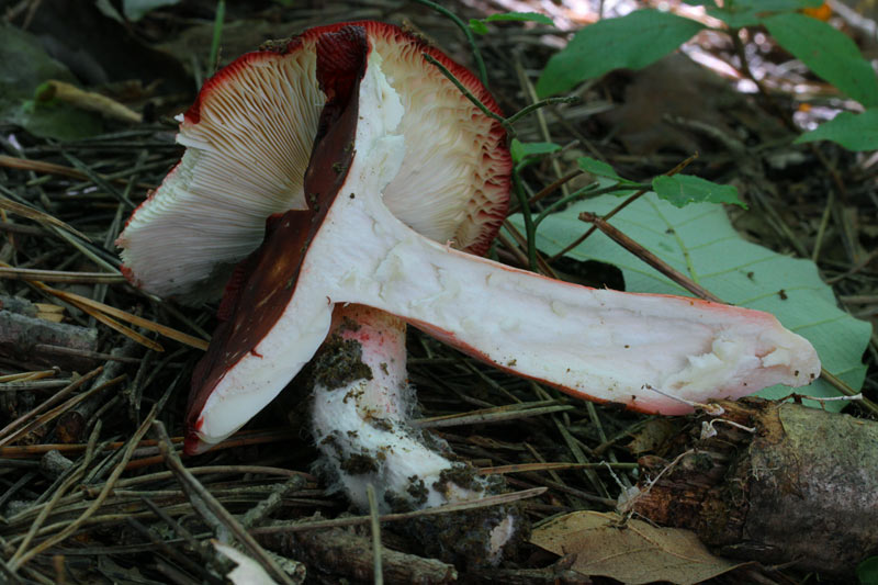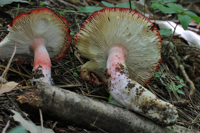 クリーム白色 傘縁部に近い部分は血赤色−紅色−赤色に縁取られる 直生−離生 密 小ヒダない 又状分岐し脈絡あり