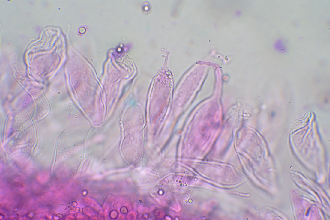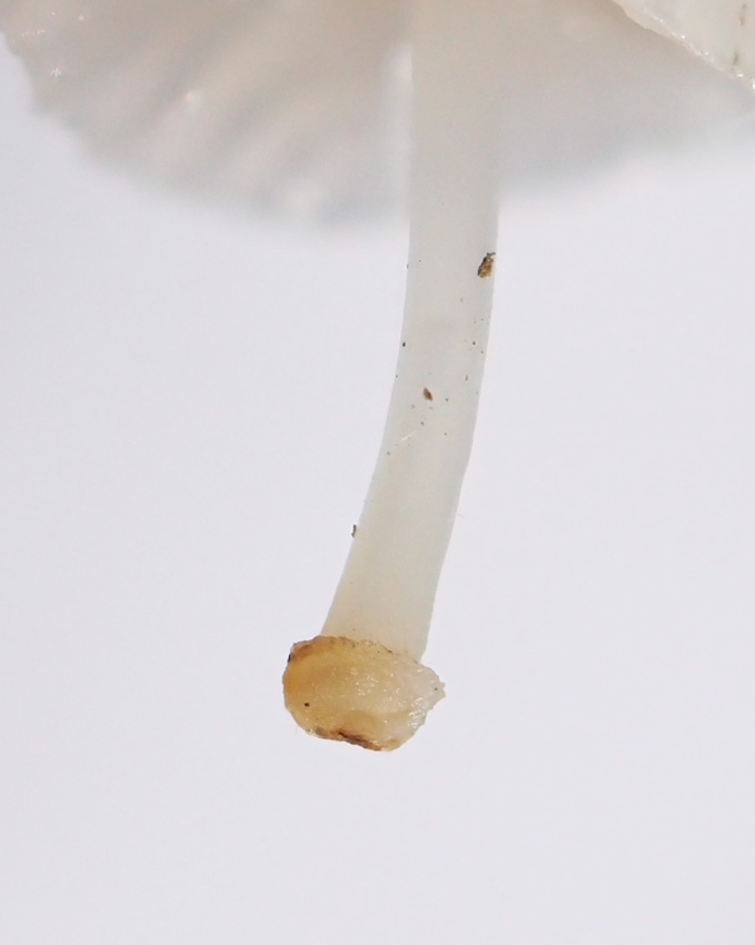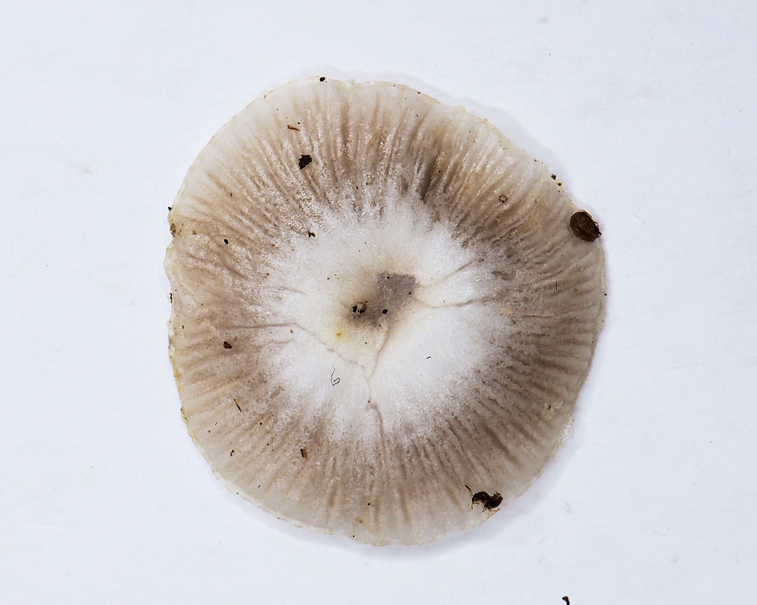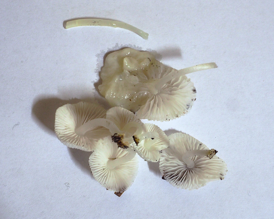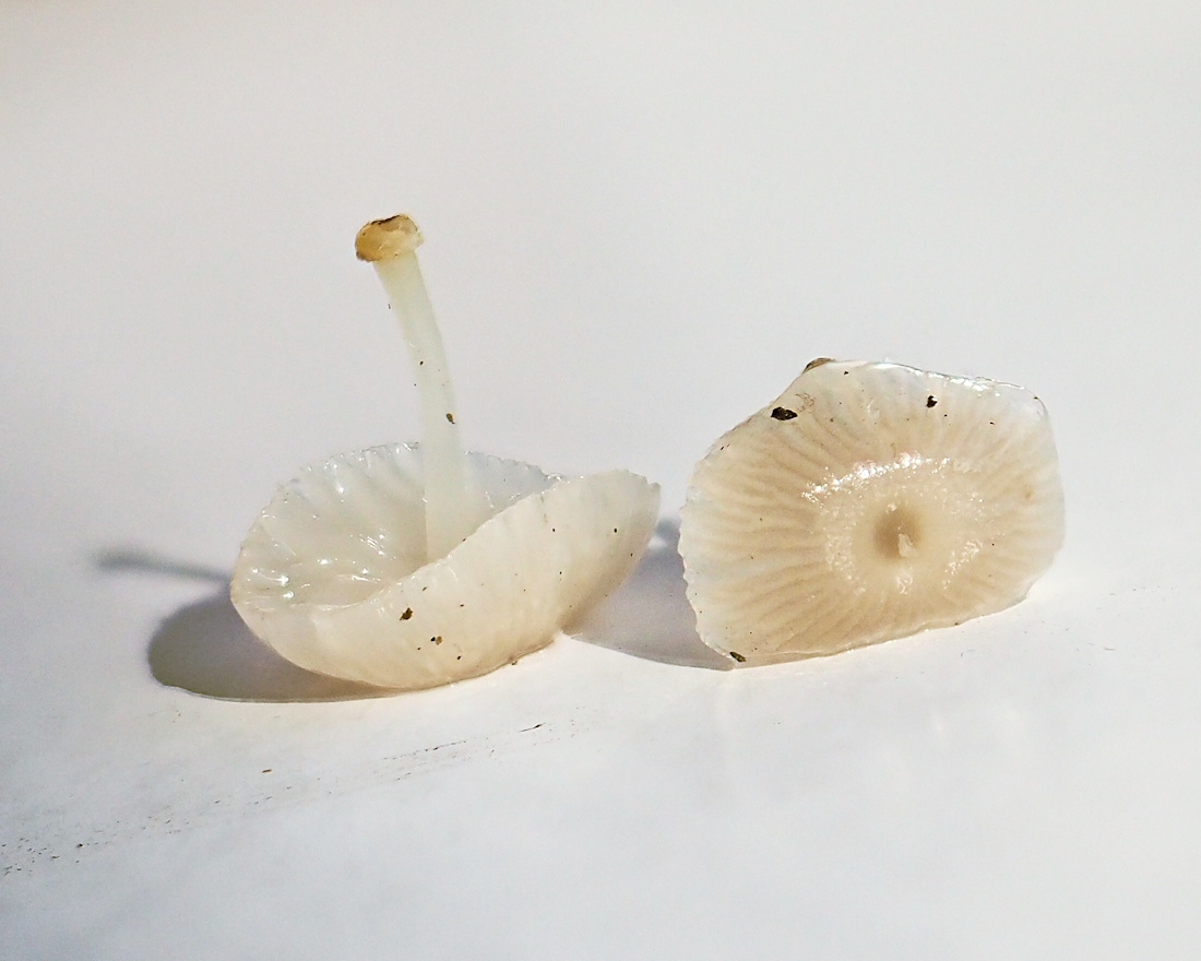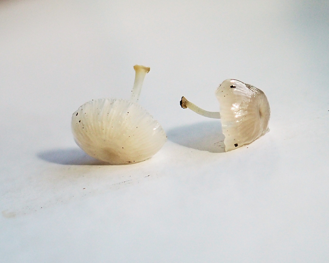 0.5-3.0cm 丸山形→まんじゅう形→ほぼ平 淡灰色で周辺部はほぼ白色 湿時放射状条線あり ゼラチン質におおわれ湿時は強粘性 強い発光性ある−ときに発光性無いものもある