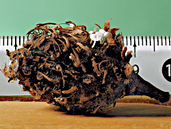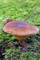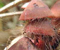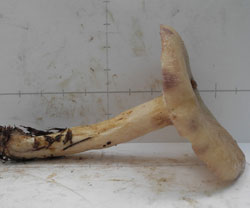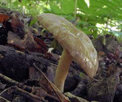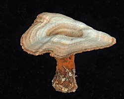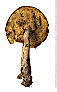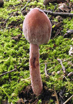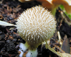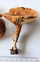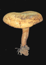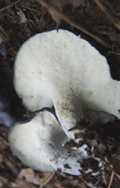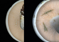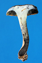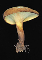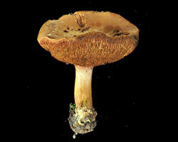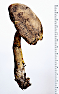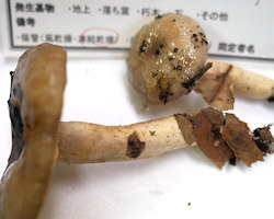 ![]() ![]() 柄基部に黄褐色粗毛菌糸あり |