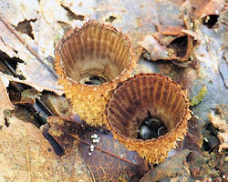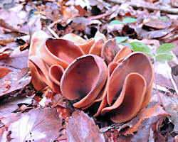 | フジイロチャワンタケモドキ | クリノイガワンタケ | タテガタツノマタタケ | ニセキンカクアカビョウタケ |