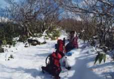 12:06 標高1,360m 小岳分岐到着 横長根分岐からここまでは膝下くらいの積雪があり,結構苦しかった。 木の枝が雪の重みで登山道を塞いでいたりで,思いの外時間がかかった。 ここから見える大焼砂にはほとんど雪がない。 12:17 出発 11分休憩 |