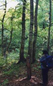 標高705m 標識あり。 標識には真昼岳2.0km 赤倉口3.5kmと記されていた。 左手にピークを見ながらトラバースし,途中から左手に小さな沢を見ながら登っていくと,周辺が開けて平たい場所に出た。周辺はブナ林の巨木で,下草にコミヤマカタバミが群生していた。 開けた休憩にいい場所だったが写真を撮って通過した。