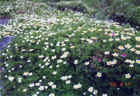 | 12:12 H1,399m ヒバクラ岳の分岐通過。 ここには一の越2.8km 頂上0.3kmの標識がある。 この場所は平らな開けた場所になっている。 ここから山頂までは,ヒナザクラとチングルマが群生していた。 山頂に行くほど花が終わり山頂付近では種になっているものが多かった。 上のチングルマの中に赤く見えるのはイワカガミ。 |