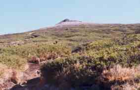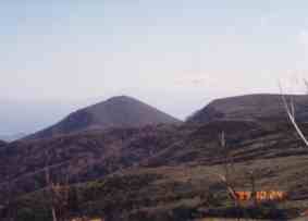 乳頭山頂は風が強く瞬く間に体が冷えてくる。山頂を越えたところで,風がやや弱いところでフリースと雨具を着込み,休憩をとった。 この場所からはこれから向かう千沼が原を囲む山が望まれる。左の写真の三角型の山と手前の尾根の間に千沼が原がある。三角山の遥か遠くには早池峰山が遠望された。(写真にはっきり写っていないのが残念。) |