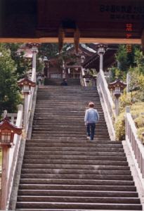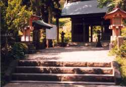 | この仁王門をくぐって本殿まで行きます。 | この階段の奥に見えるのが本殿で,登山道はこの本殿に向かって左側から登っていく。 |