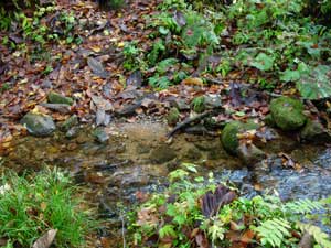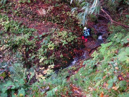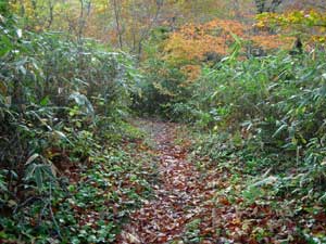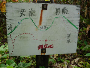 | 23:00頃 「雄勝道の駅」到着。 23:30 携帯のアラームを5:00にセットして就寝。 平成20年10月25日(土) 5:00 携帯のアラームで起床。 起床後すぐに登山の衣服に着替え,「雄勝道の駅」の中に休憩室があったので,休憩室のテーブルで朝食を済ませた。 その後,洗顔・トイレを済ませ,駐車場でお湯を沸かしてポットに詰めて出発した。 7:40 登山口駐車場到着。 あまりにも眠たいので,20分ほど仮眠することにした。 8:05 出発準備開始 踵に保護テープを貼り,登山靴を履いて出発準備を整えた。 8:17 登山口を一度出発したが,ガイド本のコピーを忘れたので取りに戻った。 8:25 標高600m 登山口出発 とりあえず600mに設定して出発。(下りで確認したところほぼ正確だった) ![]() 駐車場から名勝池の標識ある方向に進む。歩き始めてすぐに「大深沢歩道」の標柱があり右に道路があるが,踏まれていないようだ。 歩き始めは車の轍が残る作業道を進む。 8:34 標高600m 一つめの沢通過。 ![]() 大深沢の支沢と思われます。 8:41 600m。 二つめの沢通過。 ![]() 右を見ると水量は少ないですが,きれいな滝がありました。「これはきれいだ」 ![]() 登山道には落ち葉が敷き詰められ滑ります。落ち葉の下の登山道は岩が玉石状になっていて,かなり滑ります。 沢を過ぎると少しの間平坦路が続きます。8:53 標高660m 分岐到着。 ここには「左名勝池,右県境・男甑山」の地図看板有り。 地形図とガイド本と案内看板を見比べて確認しました。 ![]() 分岐からは女甑山が見えます。8:58 標高670m 分岐通過。 地形図とガイド本を見比べ,名勝池から男女のコルに登ることにして左に進みました。 5分ロスです。 9:00 標高660m 引き返す。 一度は進んだのですが,男甑山からの下り口が分からない可能性があると思い,男甑山側から登ることに変更しました。コルからの下り口は間違いなく分かるだろうと判断しました。この判断は正しかったのですが,コルからの沢トラバースは「ヘツル」様なトラバース下降で,緊張の連続でした。 9:02 標高670m 分岐通過。 男甑山に進みます。 ここから男甑山の分岐までは楽々平坦路です。15分ほど歩くと,男甑山を過ぎて先に進むように見えます。男甑山からの長い尾根を左に見ながら,さらに5分ほど歩くと,男甑山の登山道に合流しました。20分も水平移動だったので,男甑山登山道に合流するのか不安でした。 9:20 標高695m 山形ルート分岐到着。 休憩。 ブナの木に小さな標識が付いています。 ![]() 今まで左に尾根を,右に沢を見て進んできました。 「なん〜か,地形図確認で時間ばっかりかかった。」 国土地理院の地形図には甑山の登山ルートが記入されていません。また,男甑山への尾根伝いに登るルートは,ガイド本にも載っていません。 早くもお腹がすいて豆大福を食べました。 この分岐から男甑山と女甑山が見えます。写真右の大きな塊が男甑山で,左の樹木の陰に見えているのが女甑山です。 ![]() 9:35 標高695m 出発。 休憩時間。15分。 ここから尾根を登ります。 ここまで道を行ったり来たりや,地形図見たりしながら来たので,ホントは40分位で来ると思います。 標高740m付近 分岐道あり。 尾根から右に分岐してトラバース気味に進む道がありました。どちらに進むのか迷いましたが,尾根上を進むと間違いないと思い,左の登山道を進みました。右に分ける道は男甑山に直登するルートのようです。 10:00 標高860m 尾根から名勝沼見る。 写真撮りましたがきれいに撮れません。 10:03 標高870m 名勝沼きれいに見えた。 少し登ったら名勝沼が綺麗に見えたので,女甑山と合わせて写真を撮りました。女甑山の麓にあります。 女甑山はここから見ると超超急登に見えます。 ![]() 10:17 標高935m 男甑山手前ピーク通過。 T字路になっています。ここから鞍部に一度下りて男甑山に登り返します。 パートナーが「男甑山は行かない」と言ったので,私が「大した鞍部じゃない。行こう」と言って行くことになりました。パートナーにしては珍しく「引き」の発言でした。不思議です。 10:27 標高950m。 男甑山到着。 休憩。 ![]() 展望は南半分が見えます。男甑山の山頂はさすがに狭いです。10人位でいっぱいです。 男甑山に直登する登山道があります。かなり急登でジグザクに見えます。さっきの尾根分岐からここに通じていると思われます。 曇っていましたが,今は日が差してナナカマドがきれいです。背景の尖り山が女甑山です。 パートナー撮影この山頂から烏帽子岩が見えます。危うく見逃すところでした。出発間際に気がつきました。 ![]() 上2枚はいずれもパートナー撮影 |