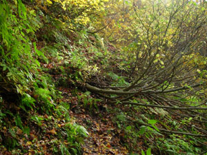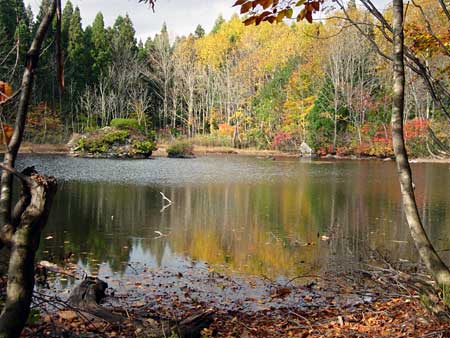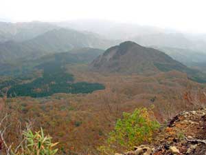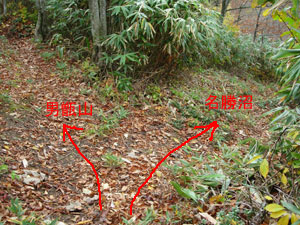 秋田県 甑山(H20.10.25) 登山ルート;駐車場(皿川林道)→名勝沼分岐→県境分岐→男甑山手前ピーク→男甑山山頂→男甑山手前ピーク→最低コル→女甑山→コル分岐→名勝沼→駐車場 標高;男甑山981m 女甑山979m |