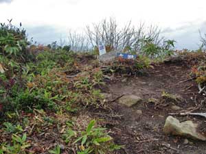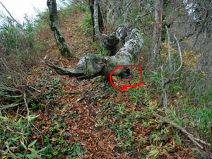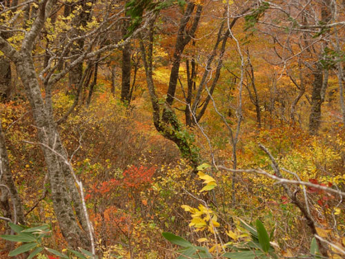 | 10:37 標高980m出発 休憩時間10分。 写真撮って出発です。 10:48 標高980m 尾根分岐通過。 登ってきたT字路の分岐です。女甑山に向かいます。 このやや横長のピークを肩まで進んだ時,一瞬道が無くなったような感じを受けたので,後から来たパートナーに「巻道とか無かったよな」と確認しました。そんな話しをしていたら,そのピーク肩からニュッと男性が出てきました。なんと仙台峰友会の会長グループでした。しばらく立ち話をして甑峠からの登山道やコルからの沢下りの情報をいただきました。立ち話で5分ロス。 急下降を下って少しだけ緩斜面になった登山道で,パートナーが倒木に頭を思い切りぶつけました。相当痛かったようです。その痛さはよく分かります。 頭をぶつけた倒木です。さらに進むと名勝沼が見えてきます。女甑山が圧倒的な存在感で立っていました。 ![]() 11:23 標高855m。 コル到着。 小休止です。男甑山の次のピークからは,かなりの急下降が続きました。 11:26 出発。 出発。 休憩時間3分。 11:27 標高850m 大カツラ分岐通過。 大カツラへの登山道があるのは知りませんでした。ネットで事前に調べたのですが分かりませんでした。 さらに5mほど進んだら,名勝沼に下りる分岐ありました。帰りはここから下山予定です。 女甑山に向かいます。 11:58 標高980m。 女甑山到着。 休憩。 かなりの急登でした。下りは滑るのでストックが必要でした。 ![]() 12:27 女甑山出発。 休憩時間29分。 ミカン,おにぎり,甘酒食べました。いよいよ下り開始です。パートナーは「そんなに時間たってない」と言って,まだのんびり休憩したいようでしたが,急がせて出発しました。 前森山が存在感を持って見えます。 男甑山への登山道が見えています。下りは急下降でよく滑り緊張しました。ストックを使って下りましたが,途中でストックが邪魔なくらいの場所もありました。木の根などに掴まり下りました。 最低コルに下りると紅葉が綺麗です。登りでも写真を撮りましたが,下りでパートナーが時間を掛けて良い構図で写真を撮りました。 パートナー撮影12:55 標高845m 名勝沼・男甑山分岐通過。 最低コルから小さなピークを越えると,名勝沼への分岐コルに出ます。 下り口は笹藪ですが,刈り払いがよくされています。初めは沢の急下降でした。沢の緩斜面に下りてホッとしたら,そこからホントの緊張を強いられました。 緩斜面からは左に沢を見ながらのトラバースですが,足をかける石が滑る上に,「へつる」ようなトラバースの下りなので本当に怖いです。 写真では「へつり」の状況は分かり難いのですが,樹木の幹が真横か下方向に伸びています。13:31 標高670m 名勝沼到着。 休憩。 「甑峠」と「甑のコル」の道標あり。沢に沿ってず〜と「へつる」ようなトラバースでした。「けっこう緊張したよ〜」 ![]() 沼には小さな島があり景勝を形つくっています。しかし,写真で見るほど良い雰囲気ではありません。 甑峠方向に20mほど登った林の中で休憩しました。 13:43 標高670m 出発。 休憩時間12分。 休憩場所からほんの少し進んだら,沼全体が見渡せる良い場所になっていました。ただ,周辺はぬかるみ気味なので,休憩場所としては適していません。 13:59 標高685m。 男甑山分岐通過。 登りの時に右折した場所です。 14:12 標高615m 二つめの沢通過。 きれいな滝あるところです。 一つ目の沢を通過して作業道らしき道に出ました。登山口までもうすぐです。 14:25 標高610m 登山口到着。 地形図には登山道が明記されていなくて,現地の案内標識と地形図を照らし合わせながら登りました。コルからの下りは想像以上に緊張を強いられましたが,楽しい山歩きでした。 14:55 駐車場車を出発。 途中温泉に寄りたいと思っていましたが,登山口近くで温泉を見つけることができませんでした。 19:40 居住地到着。 荷物を降ろし終わったのは19:50分です。洗濯は明日です。 途中咲いていた高山植物等 イワカガミ。 1種。 |