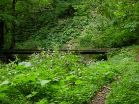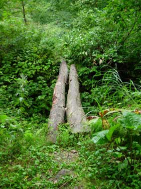 7:45 標高520m 林道終点出発 丸太橋です。沢に丸太2本が架かっていますが,ここは渡らないほうがよいです。 少し下の駐車スペースの所から,渡渉して進んだ方がよいです。こちらのほうに道がしっかり付いています。 |