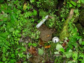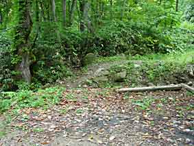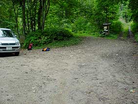 ![]() 左が駐車スペースで,奥に看板が見えている左側に丸太2本橋が架かっています。 ![]() 沢渡渉の登山口です。駐車スペースの奥です。 |