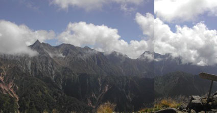 | 10:40 鏡平山荘出発 休憩時間45分 あまりにも気持ちよくて,のんびりしてしまいました。 双六小屋までは時間はたっぷりあります。 11:08 標高2,350m 弓折中段通過 相変わらず天気がよいですが,穂高岳に雲がかかってきています。ちょっと残念。 11:32 標高2,475m 弓折岳分岐着 休憩 槍ヶ岳にガスがかかり始めて見えません。残念です。しばらく待ってみましたが,一瞬の晴れ間しかありません。穂高岳は完全に雲の中です。こちらは今日はダメみたいです。 ![]() 槍ヶ岳です。 穂高連峰です。 |
