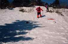 ロープウエイ終点の登山口。 左の方に回り込む道も付いているので,そちらに進みそうになる。 登山者右足元にあるのが,登山案内看板。 ここを登り切るとすぐに,薬師岳山頂を右に見る分岐にでる。